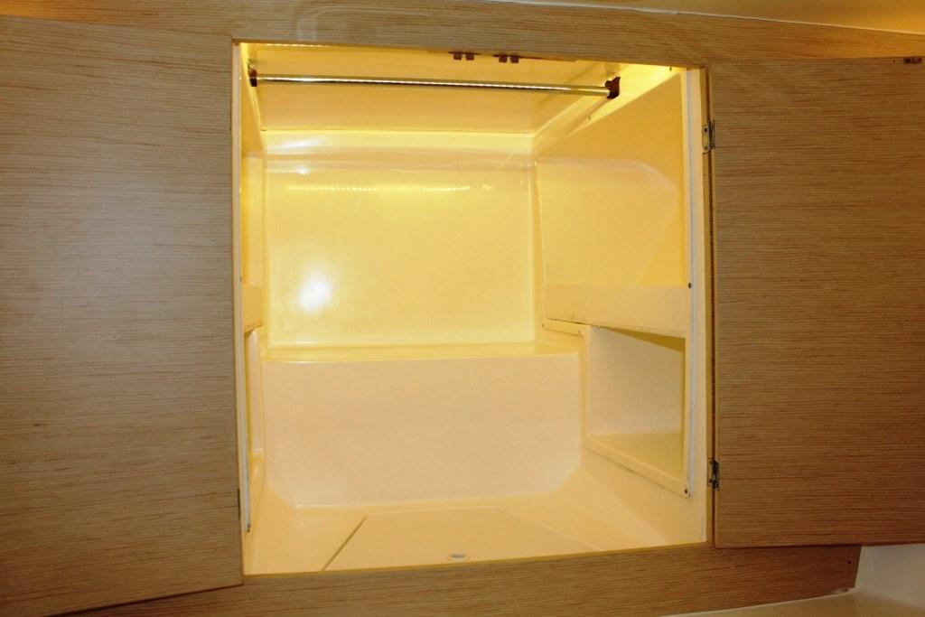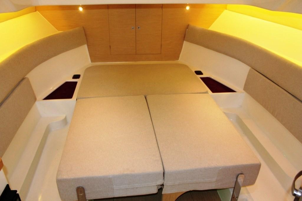Cabine à l’avant avec lit rétractable, transformable en dinettes. Cabine arrière très confortable et salle de bains séparée avec lavabo, douche et toilettes. Cockpit arrière allongé, micro-ondes, réfrigérateur.