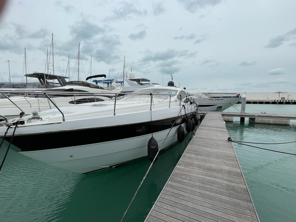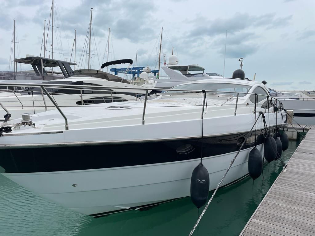 Eau sous pression, 2 Chargeur de batterie (dictron), Couleur spéciale (scafo bianco con fascia grigio scuro metallizzato lucidatura /verniciatura 2021), Douche de cockpit, Phare de poursuite, Hard top (elettrico), Spots sous-marins, Passerelle (besenzoni), Plateforme arrière, Cockpit en teck, 2 Prise de quai, Rollbar, Guindeau électrique, Echelle de bain, table de cockpit, 2 Winch électrique arrière.