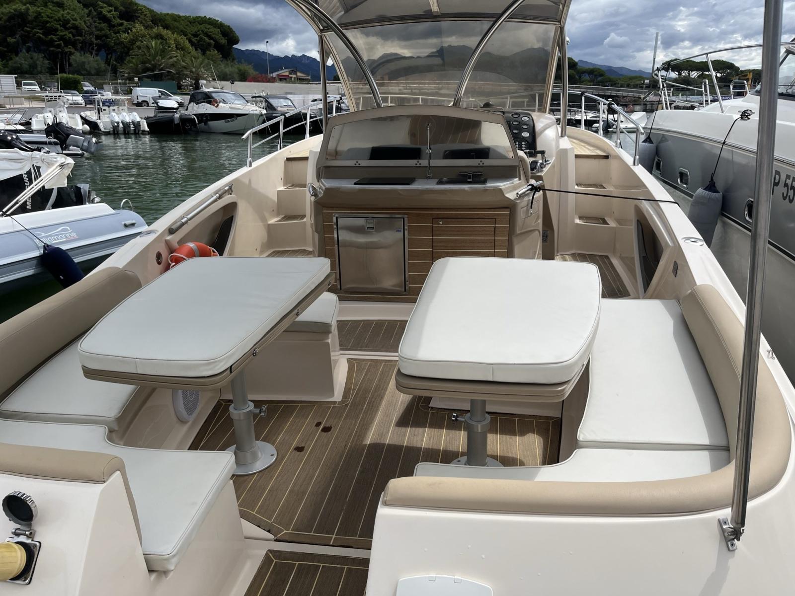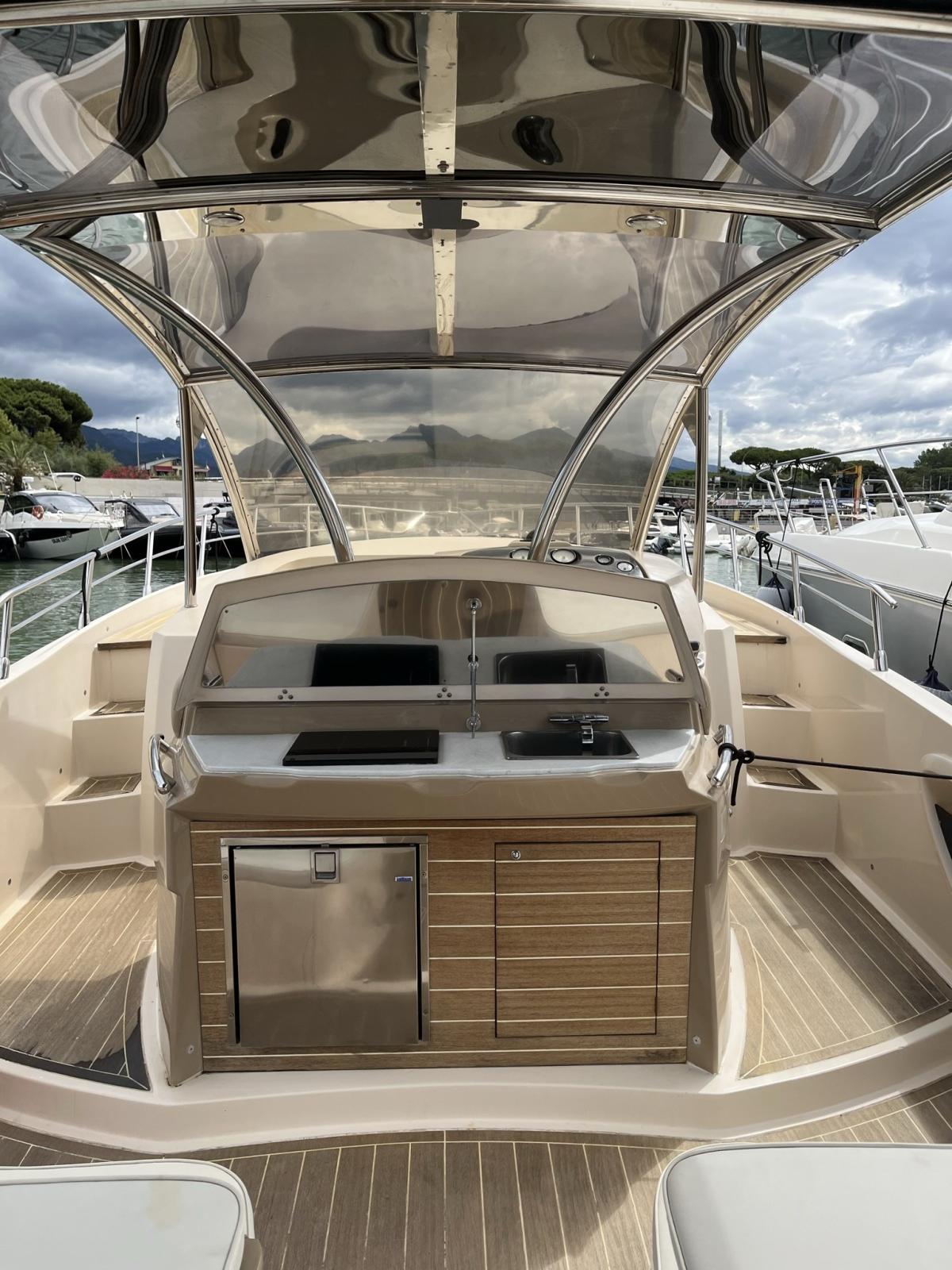 Flaps hydrauliques, Extincteur(s) fixe(s), Plateforme arrière (AD IMMERSIONE), Cockpit en teck, Prise de quai, Guindeau électrique, Echelle de bain, table de cockpit.