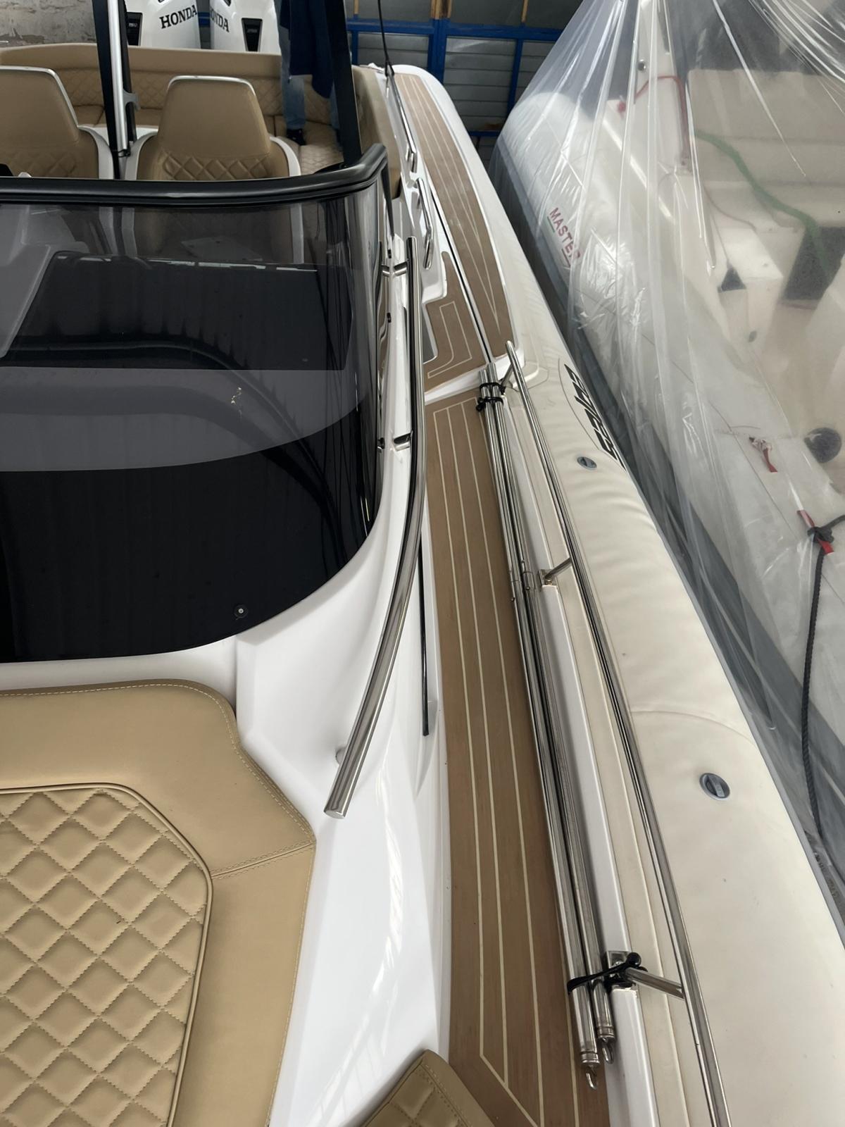 Propulseur d’étrave Cuisinière à gaz Réfrigérateur en acier inoxydable Gonfleur électrique 12 volts LED Éclairage intérieur et extérieur Kit de courtoisie (Nr.2 Lampes de plongée + Nr.6 Lumières de courtoisie) Kit de table électrique Barre de sécurité en fibre de verre avec T-TOP Auvent avec kit suspendu d’auvent