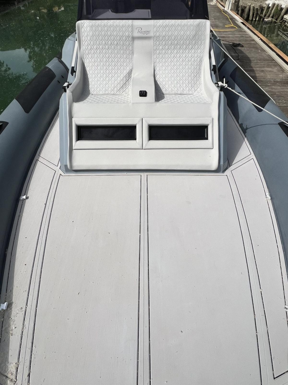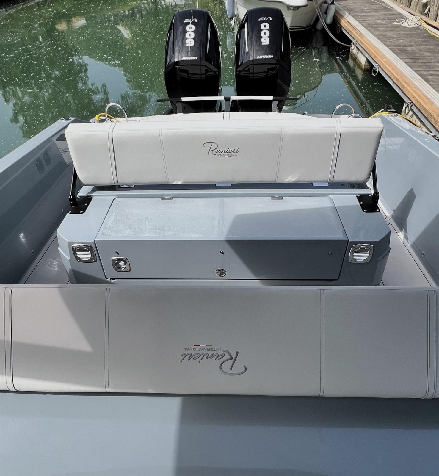 RANIERI CAYMAN 45 NOUVEAU AVEC DEUX COCKPIT MERCURY 600 CV 12V - Coque d’ancre et de chaîne - Support en aluminium avec plates-formes intégrées et échelles d’escalade en acier inoxydable - Câble de sécurité à chaîne - Cube d’ancre en acier inoxydable - Coussins extérieurs complets, anti-UV et résistants à l’eau avec cellule fermée - Douche design arrière - Chaise longue et accoudoir doubles - Coffre d’ancre et collection de chaînes contre-moulées - Gonfleur électrique 12 volts - Toit rigide en carbone blanc - structure acier noir - Bande lumineuse LED Hard-Top - Inserts muraux latéraux rembourrés - Évier en acier inoxydable avec robinet rétractable - Lumière de courtoisie à l’arrière du coffre - Lumière de hangar locale - LED de courtoisie dans le cockpit - Feux de navigation - Mains courantes d’espace de vie recouvertes d’éco-cuir - Mains courantes de rouf recouvertes d’éco-cuir - Nez en fibre de verre à l’avant - N° 2 Réfrigérateurs à tiroirs 50 lt - N° 12 Porte-verres - N° 2 Échelles d’escalade télescopiques rétractables - N° 4 Sièges avec boolster dans l’espace de vie - 2 Taquets d’amarrage - N° 4 Taquets d’amarrage rétractables - N° 2 Tables arrière télescopiques électriques indépendantes - Pare-brise panoramique - Cockpit avec Seadeck - Trappe de hangar électrique - Bain de soleil central convertible - Bain de soleil arrière double avec appui-tête inclinable - Bain de soleil avant - Prise de courant 110/220 Volts - Coque Redan HIS Gen III - Guindeau électrique - Sellerie de luxe - Tubulaires bicolores Artic Grey / Inserts lisses - Couleur gelcoat blanc : coque, rouf, rouf, poste d’habitation, nez de proue, trappe de garage CABINE BOW Armoire en chêne gris foncé avec plateau rembourré - Canapé-coin dinette en tissu convertible en lit double - Lit double confort - N° 2 Grandes fenêtres latérales avec rideaux - N° 2 Fenêtres centrales ouvrables avec moustiquaires - N° 2 Lampes de lecture - Prise USB - Murs avec panneaux en éco-cuir - Bande LED - Table cabine télescopique SALON N° 2 Fenêtres centrales ouvrables avec moustiquaires - Mobilier de cabine en chêne gris foncé - Tableau électrique - Prise de courant 110/220 Volts - Prise USB - Panneau de sauvetage - Échelle d’accès à la cabine avec marches en chêne gris foncé CONSOLE Boussole intégrée - Tableau de bord peint de la même couleur - Repose-pieds - Prise 12 Volts - Prise USB - Système de direction électro-hydraulique - Volant en édition spéciale - Klaxon électrique CABINE POPP Armoire en chêne gris foncé - N° 2 Fenêtres centrales ouvrables avec des moustiquaires - N° 2 Lits simples convertible en lit double - N° 2 Lampes de lecture - Parquet en chêne gris foncé - Prise USB - Murs avec panneaux en éco-cuir - Bande LED - Compartiments ouverts en chêne gris foncé SALLE DE BAIN Salle de bain - Balcon King Starboard - Lavabo en verre noir mat avec mitigeur - Armoire en chêne gris foncé avec dessus laqué noir - N° 2 Fenêtres centrales ouvrables avec moustiquaires - Prise de courant 110/220 volts - Douche de tête intégrée au plafond et douchette avec mitigeur deux sorties - Miroir - Spot LED - Toilette marine électrique avec réservoir d’eaux noires SYSTÈMES Système d’eau douce chaude/froide avec réservoir de 200 litres et chaudière à eau chaude de 25 litres - Système d’eaux noires avec réservoir de 120 litres équipé d’une pompe de vidange et d’une prise d’aspiration depuis le quai - Système d’alimentation en carburant avec réservoir de 1450 litres complet avec ventilateur - Système électrique préparé pour les batteries N° 4/5 - Système d’extinction d’incendie avec fireport - Système stéréo HERTZ avec 4 haut-parleurs internes et 4 haut-parleurs externes - N° 3 pompes de cale - Panneau électrique général - Interrupteur de batterie électro-actionné avec commande manuelle d’urgence
