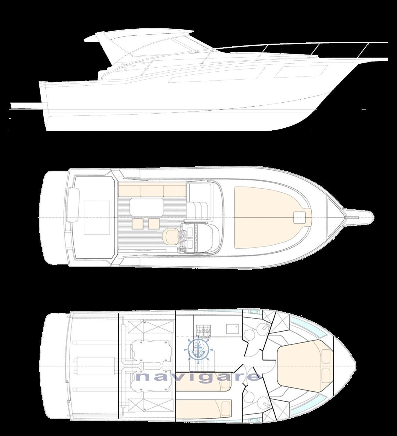 Un bateau intemporel aux lignes incomparables du sport de pêcheur américain. Étrave étoilée, V avec une hauteur de terre arrière de 18° pour permettre des vitesses de croisière supérieures à 25 nœuds avec un maximum de 34 nœuds. Une poupe basse et une proue haute pour naviguer en toute sécurité même dans une mer agitée, et des pavois évasés qui donnent un pont large, pour avoir beaucoup d’espace pour bronzer ou passer du temps à se détendre. Espace détente extra-large pour donner à chacun l’espace dont il a besoin.