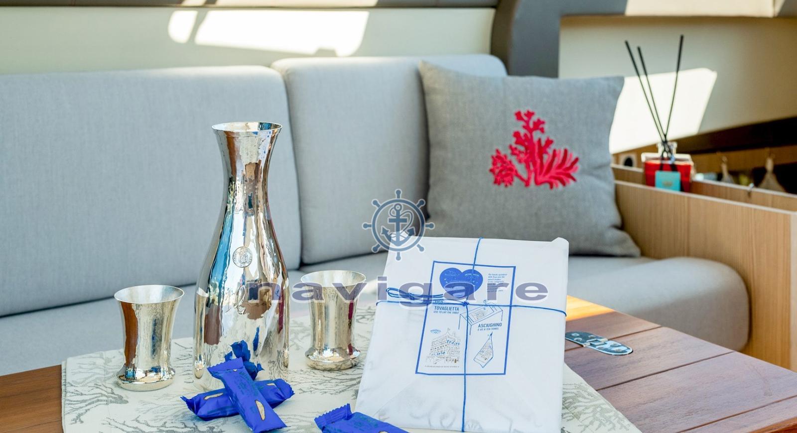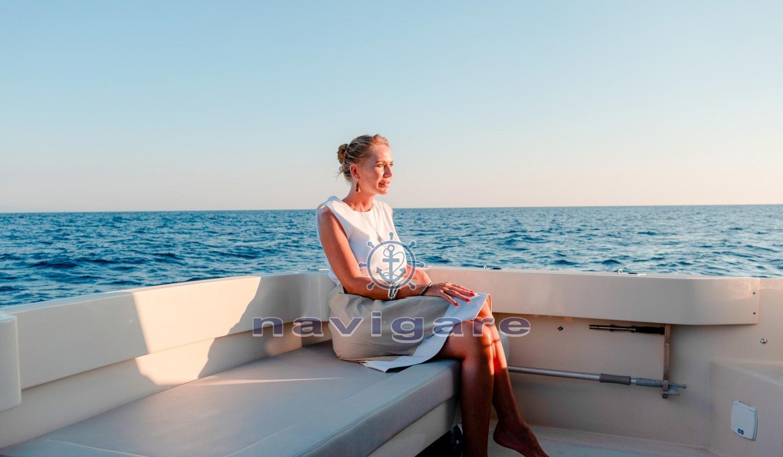 Douche de cockpit, Hard top, Porte latérale (addizionale), Prise de quai, Connexion eau sous pression à quai, Guindeau électrique, Echelle de bain, Corne.