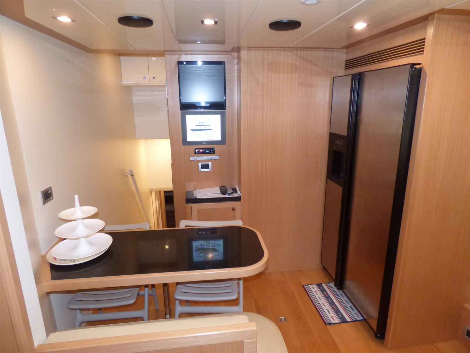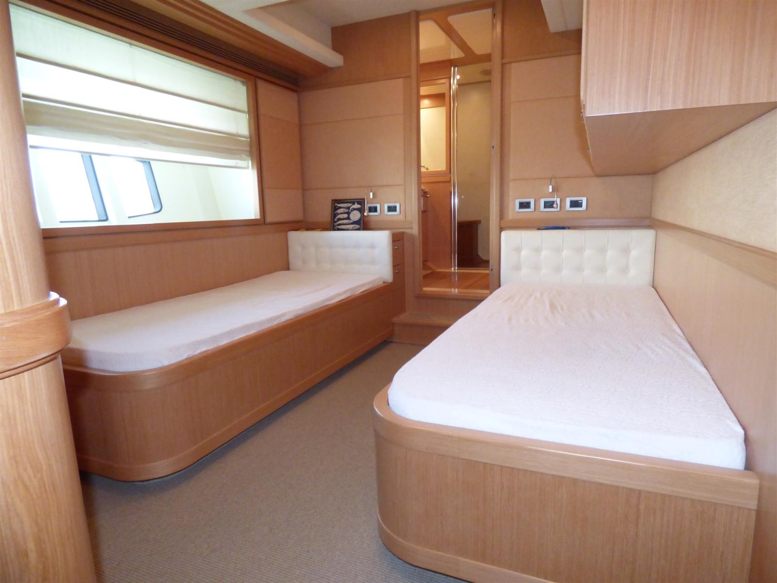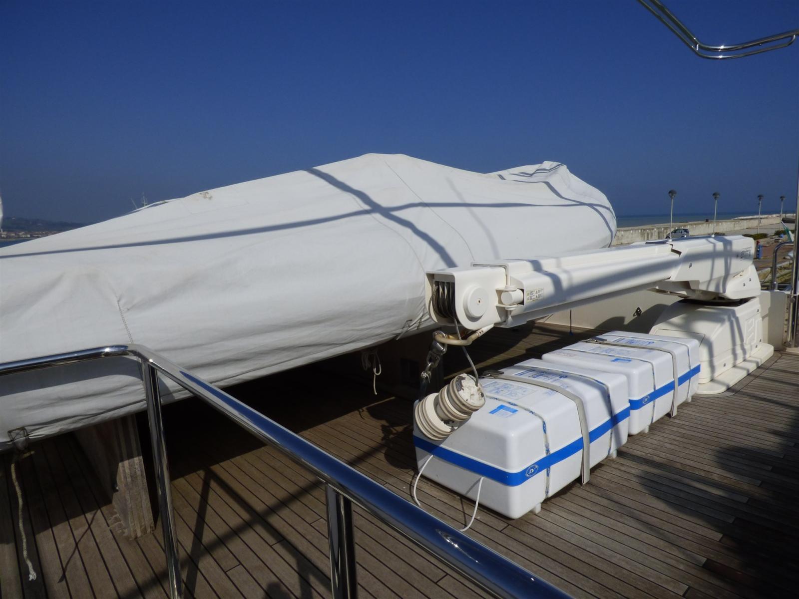 Alarme moteur, Alarme de pompe de cale, 2 Ancre, 2 Eau sous pression, 12 Batteries, Passavant en teck, 2 Chargeur de batterie, 2 Douche de cockpit, Phare de poursuite, Garage à annexe, Grue de flybridge, Extincteur(s) fixe(s), Lavage de chaine, Passerelle (a scomparsa), 5 Pompe de cale automatique, Pompe de cale électrique (centralizzata), Pompe de cale manuelle, 2 Porte latérale, Cockpit en teck, Prise de quai, Connexion eau sous pression à quai, Onduleur, 2 Guindeau électrique, Echelle de bain (idraulica), Système de filtration des eaux usées, 2 Stabilisateurs (zero speed), table de cockpit (teak), Annexe (Zodiac 490 con motore Johnson 70 hp), 2 Winch électrique arrière, Winch électrique avant.