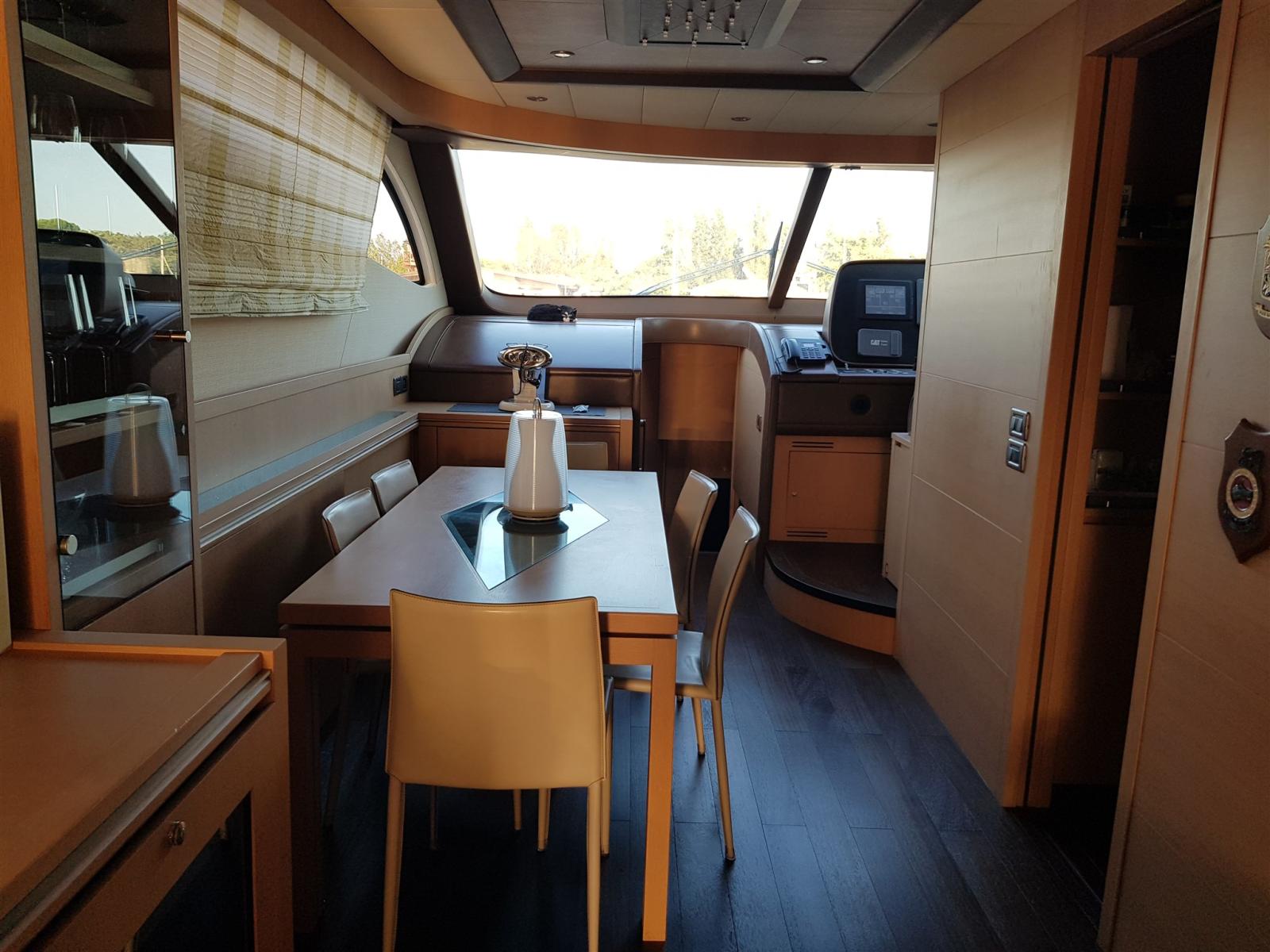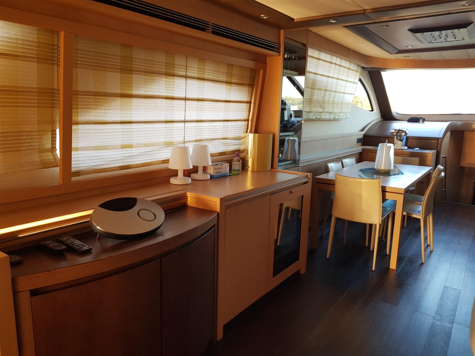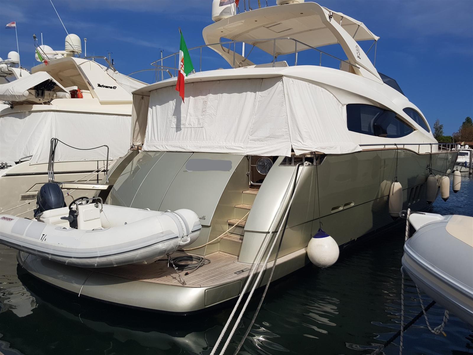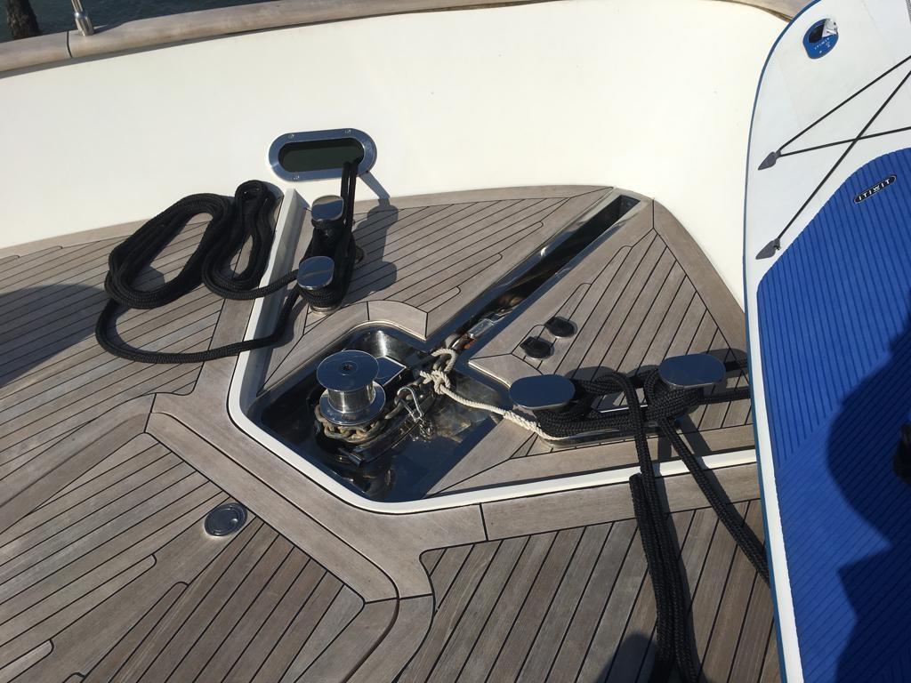 Alarme moteur, Alarme de pompe de cale, 2 Eau sous pression, 10 Batteries, Passavant en teck, 2 Chargeur de batterie, Couleur spéciale, Douche de cockpit, Double barre à roue, Propulseur de poupe (idraulica), Propulseur d'étrave (idraulica), Flaps hydrauliques, Extincteur(s) fixe(s), Compresseur de plongée, Indicateurs de flaps, Lavage de chaine, Éclairage de courtoisie, Passerelle (a scomparsa), Plateforme arrière, 4 Pompe de cale automatique (con impianto centralizzato), Porte latérale, Porte latérale, Cockpit en teck, Prise de quai, Connexion eau sous pression à quai, Onduleur, Rollbar (fly), Guindeau électrique, Echelle de bain, table de cockpit, Corne, Pont en teck, 2 Winch électrique arrière.