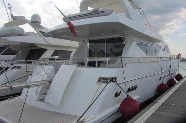 Alarme moteur, Alarme de pompe de cale, Eau sous pression, 10 Batteries, Passavant en teck, Douche de cockpit, Double barre à roue, Phare de poursuite, Flaps fixes (N°2), Grue de flybridge, Extincteur(s) fixe(s), Indicateurs de flaps, Éclairage de courtoisie, Spots sous-marins, Passerelle (IDRAULICA), Plateforme arrière, Pompe de cale automatique, Pompe de cale manuelle, Porte latérale, Cockpit en teck, Prise de quai, Onduleur, Guindeau électrique, Echelle de bain (elettrica), Système de filtration des eaux usées, table de cockpit, Annexe (idrogetto), Filières avec sortie latèrale, Corne, 2 Winch électrique arrière, 2 Winch électrique avant.