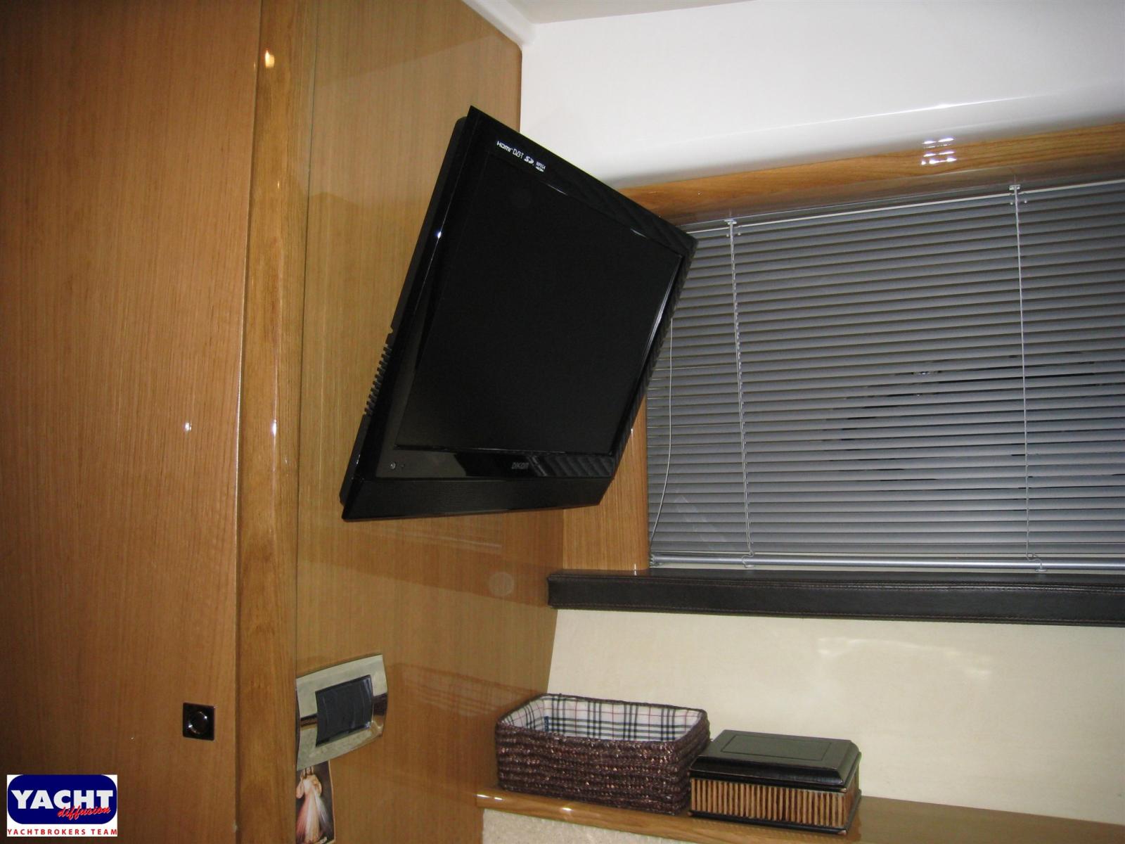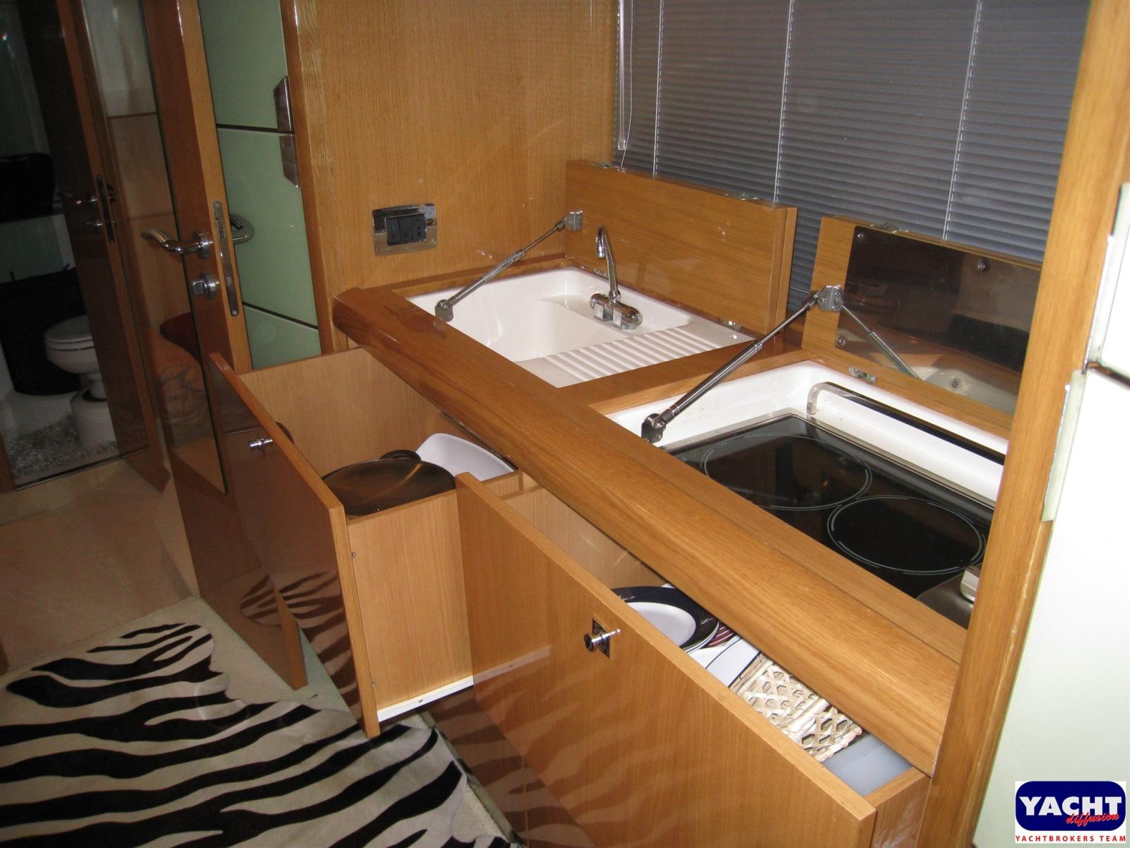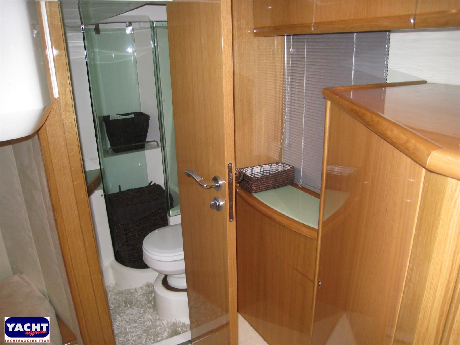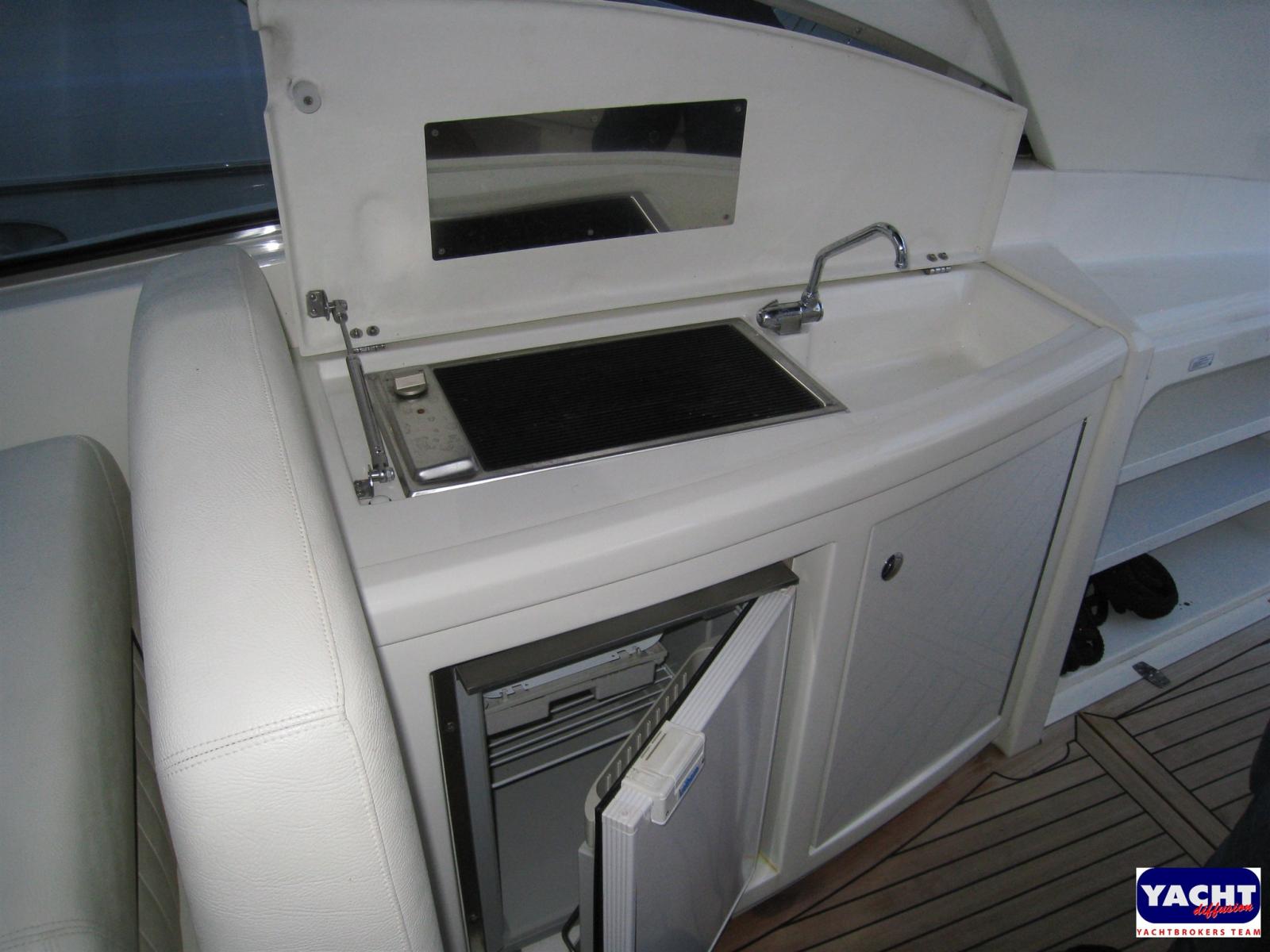 Alarme moteur, Alarme de pompe de cale, Ouverture du compartiment moteur électrique, Eau sous pression, Douche de cockpit, Phare de poursuite, Flaps hydrauliques, Garage à annexe, Extincteur(s) fixe(s), Indicateurs de flaps, Éclairage de courtoisie, Spots sous-marins, Passerelle (Idraulica), Plateforme arrière, Pompe de cale automatique, Cockpit en teck, Prise de quai, Connexion eau sous pression à quai, Onduleur, Rollbar, Guindeau électrique, Echelle de bain, Système de filtration des eaux usées, table de cockpit, Table pliante de salon, Corne.