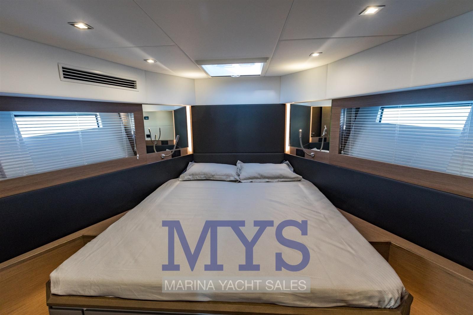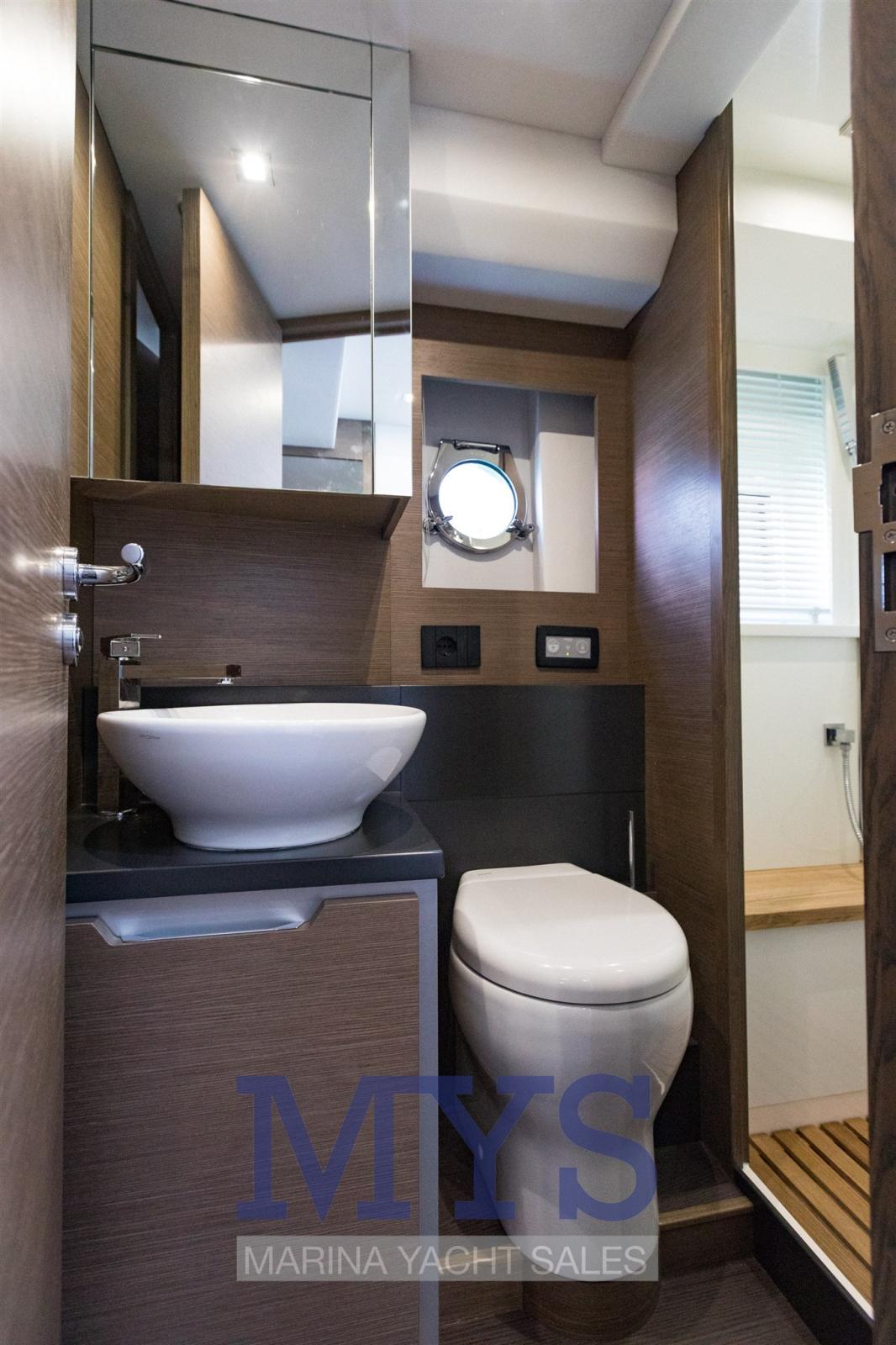 Cabine principale pleine largeur au milieu du navire avec lit double péninsule, salle de bain attenante avec cabine de douche séparée