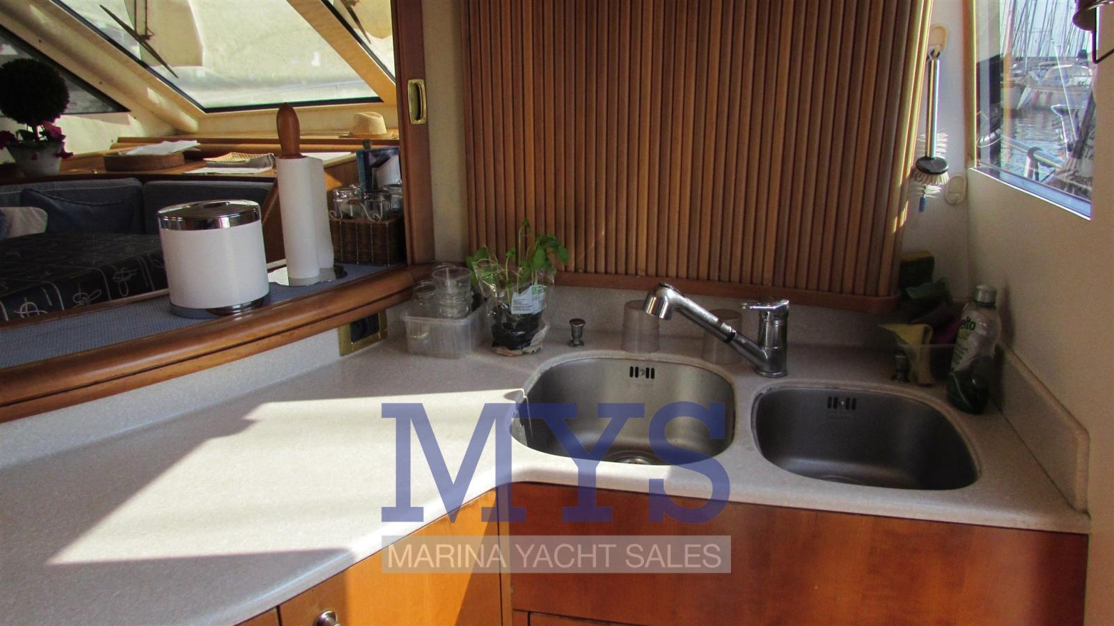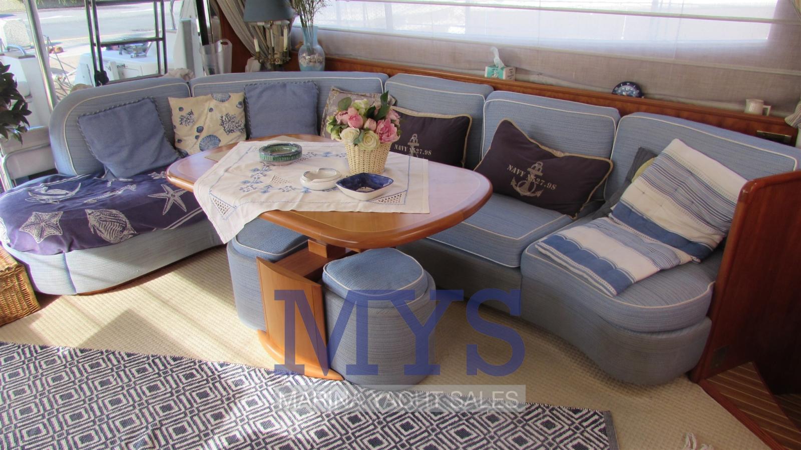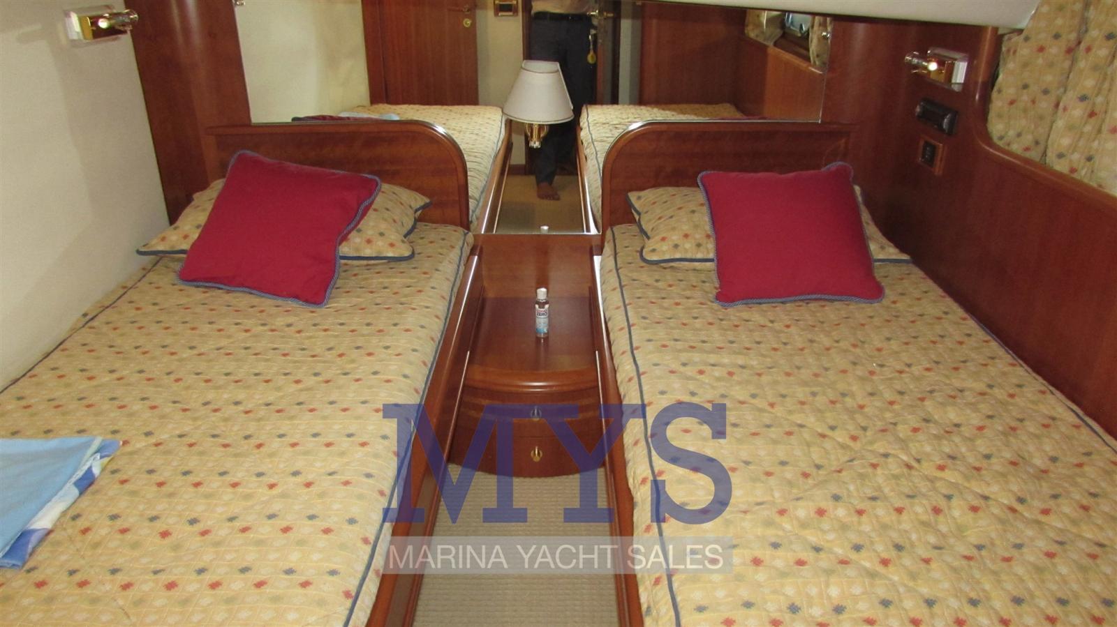 Il dispose d’un grand salon sur le pont principal avec un canapé en forme de U, une table basse basse et des tabourets, plus à l’avant se trouve la cuisine fermée à tribord, le poste de pilotage principal et une généreuse table à manger à bâbord avec un canapé en forme de L et des tabourets. Sous le pont, il y a quatre cabines spacieuses, une cabine principale pleine largeur, avec salle de bain privée avec bidet et douche d’hydromassage, une cabine VIP à l’avant avec salle de bain et deux cabines doubles avec lits simples à tribord et à bâbord. À l’avant, les quartiers de l’équipage avec deux lits plats et une salle de bain. À l’arrière, il y a un local technique avec buanderie et accès à la salle des machines.