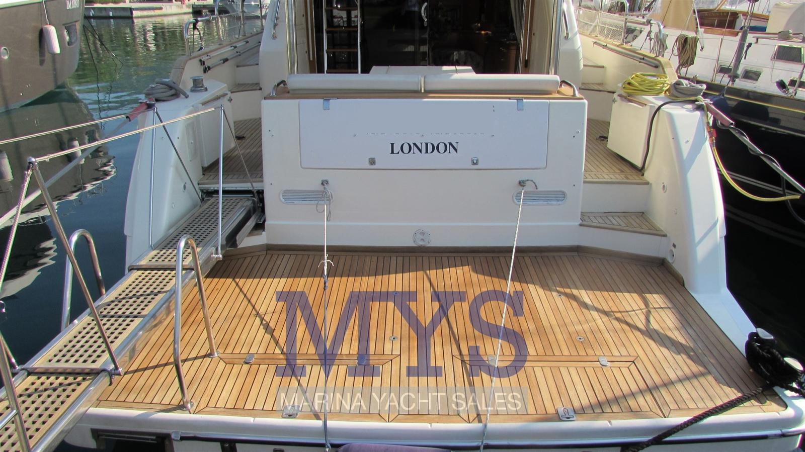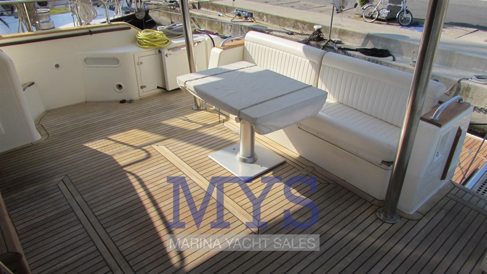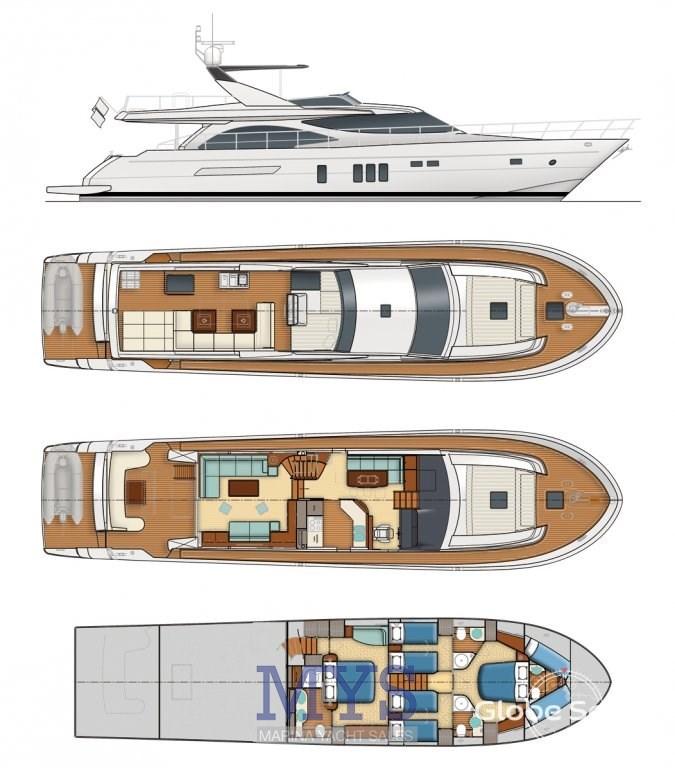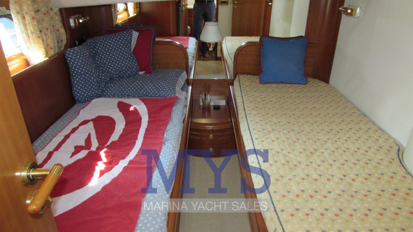 Il dispose d’un grand salon sur le pont principal avec un canapé en forme de U, une table basse basse et des tabourets, plus à l’avant se trouve la cuisine fermée à tribord, le poste de pilotage principal et une généreuse table à manger à bâbord avec un canapé en forme de L et des tabourets. Sous le pont, il y a quatre cabines spacieuses, une cabine principale pleine largeur, avec salle de bain privée avec bidet et douche d’hydromassage, une cabine VIP à l’avant avec salle de bain et deux cabines doubles avec lits simples à tribord et à bâbord. À l’avant, les quartiers de l’équipage avec deux lits plats et une salle de bain. À l’arrière, il y a un local technique avec buanderie et accès à la salle des machines.