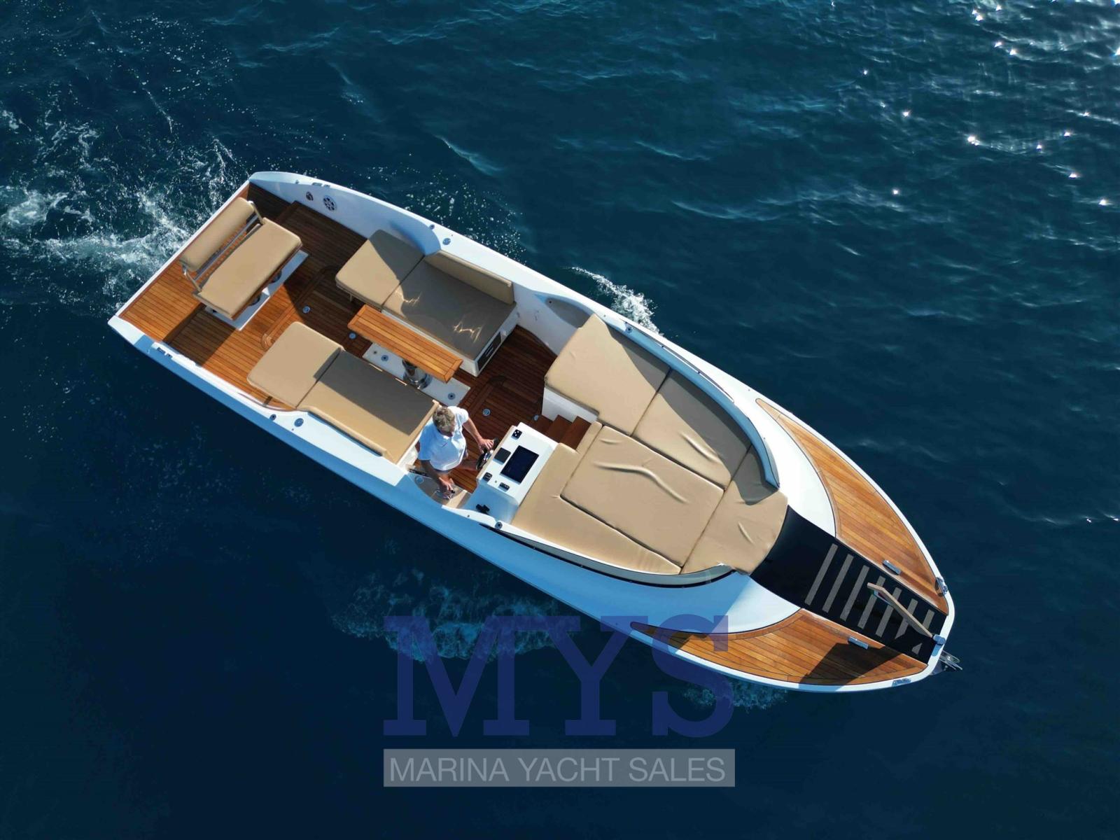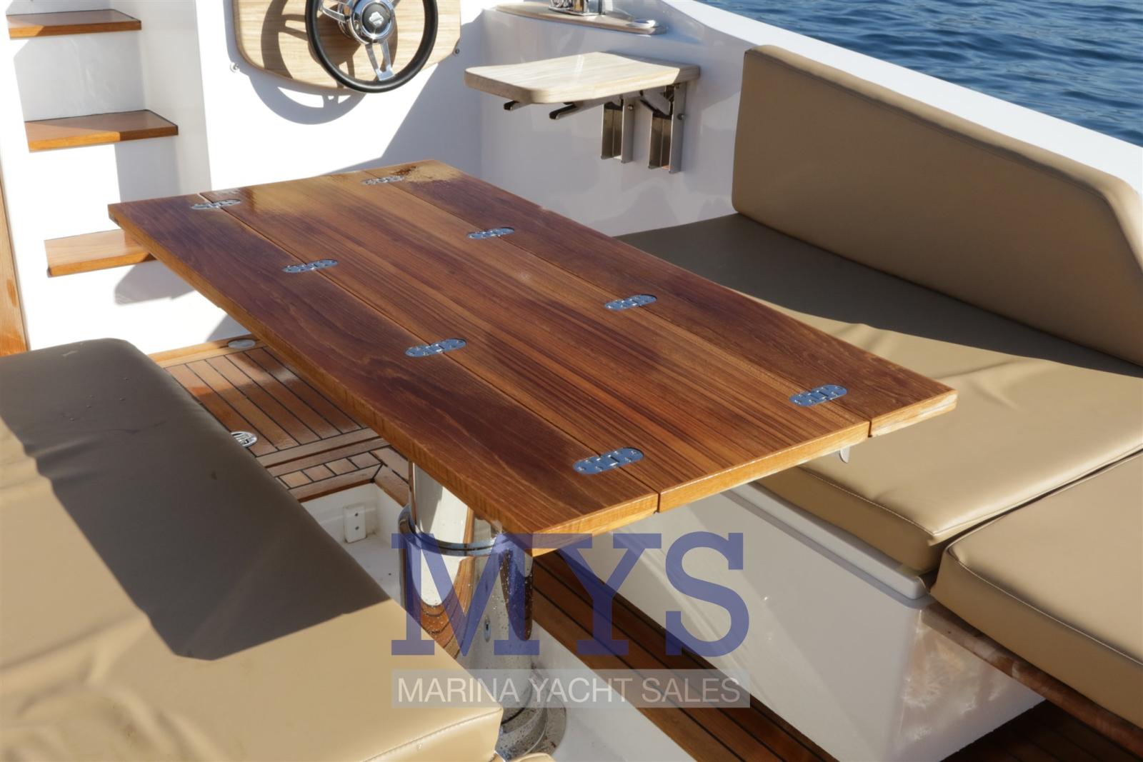 Alarme gaz, Alarme moteur, Alarme de pompe de cale, Eau sous pression, 3 Batteries, Taquets pliants, Douche de cockpit, Propulseur de poupe (Solo con monomotore), Flaps électriques, Extincteur(s) fixe(s), Indicateurs de flaps, Éclairage de courtoisie, Plateforme arrière (Teak), Pompe de cale automatique, Pompe de cale manuelle, Cockpit en teck, Prise de quai, Connexion eau sous pression à quai, Guindeau électrique, Echelle de bain, table de cockpit (idraulico), Corne, Pont en teck.
