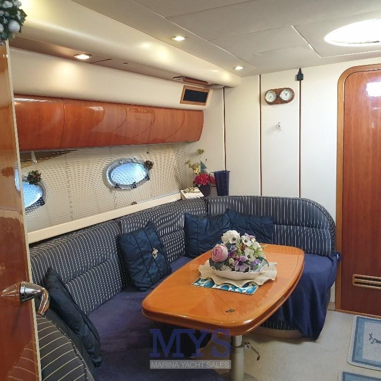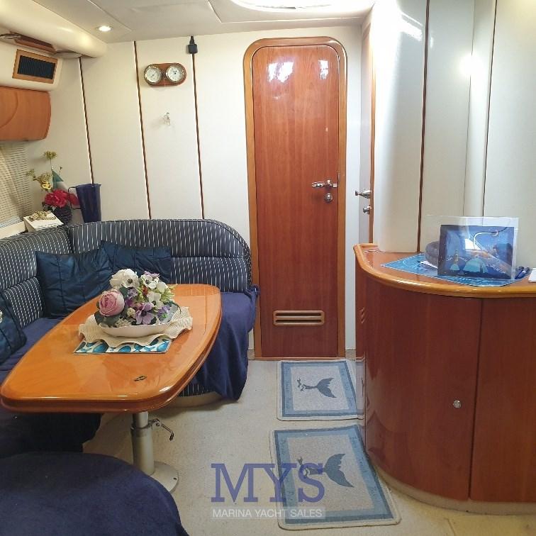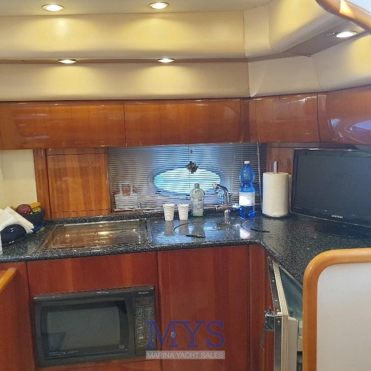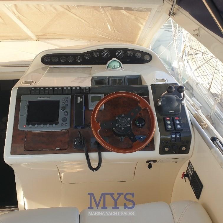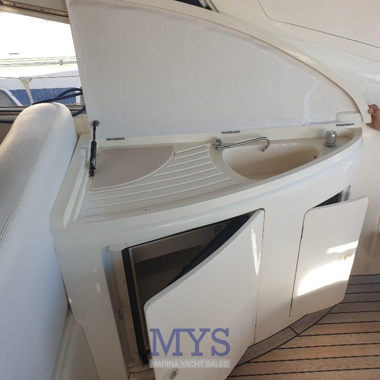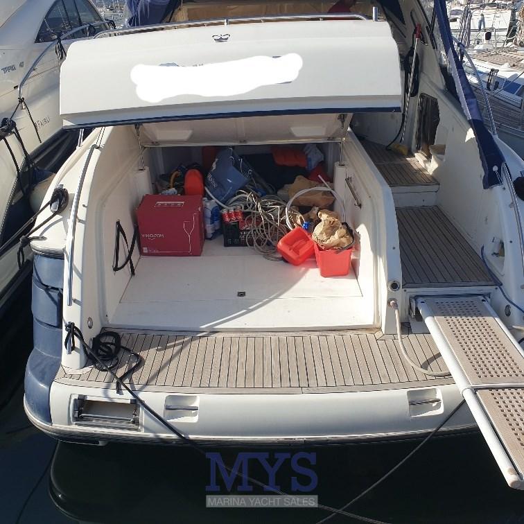 Alarme moteur, Alarme de pompe de cale, Ancre (Bruce + 75 mt catena), Eau sous pression, 4 Batteries, Douche de cockpit (Calda/Fredda), Phare de poursuite, Flaps hydrauliques, Garage à annexe, Lavabo dans le cockpit, Éclairage de courtoisie, Passerelle (Idraulica a scomparsa), Plateforme arrière (Rivestita teak), Pompe de cale automatique, Pompe de cale manuelle, Cockpit en teck, Prise de quai, Connexion eau sous pression à quai, Onduleur, Rollbar, Guindeau électrique, Echelle de bain, table de cockpit, Table pliante de salon, Corne.
