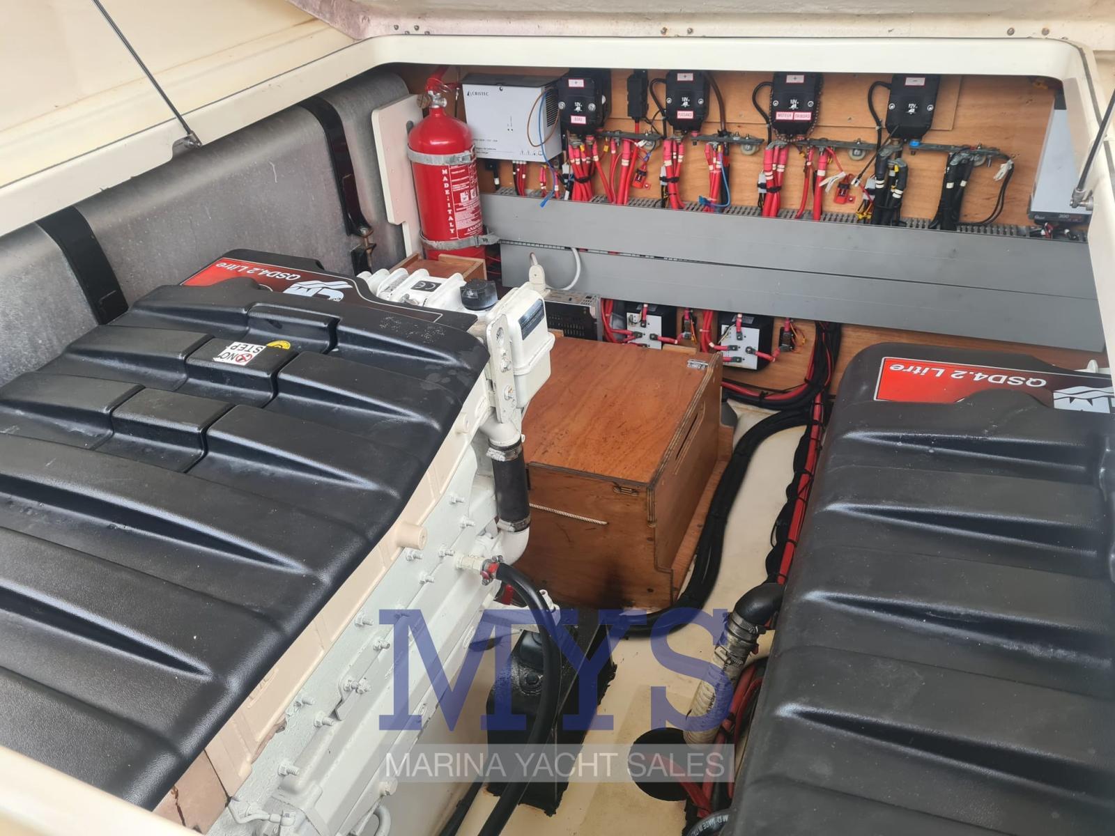 Alarme gaz, Alarme moteur, Alarme de pompe de cale, Ancre (Bruce), Eau sous pression, Batteries (8 120 Ah), Chargeur de batterie (2), Couleur spéciale (Wrapping 2021), Douche de cockpit, Flaps électriques, Garage à annexe, Lavabo dans le cockpit, Éclairage de courtoisie, Spots sous-marins, Passerelle (idraulica a scomparsa), Plateforme arrière (in teak), Pompe de cale automatique, Pompe de cale manuelle, Porte latérale, Cockpit en teck, Prise de quai, Connexion eau sous pression à quai, Onduleur, Guindeau électrique, Echelle de bain, table de cockpit, Annexe, T-Top (Hard Top elettrico).