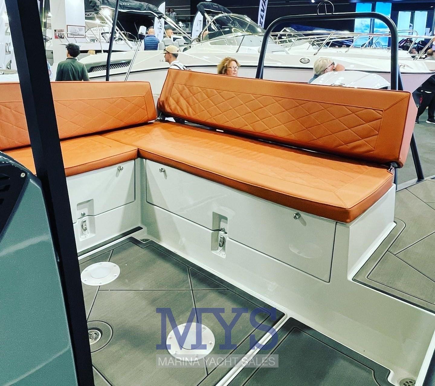 Crochet de remorquage pour ski nautique, Éclairage de courtoisie, Spots sous-marins, Cockpit en teck (sintetico), Echelle de bain, T-Top.