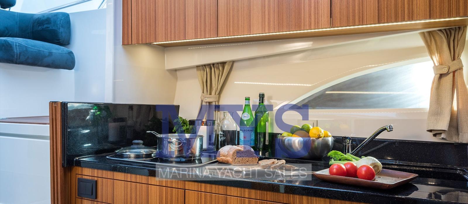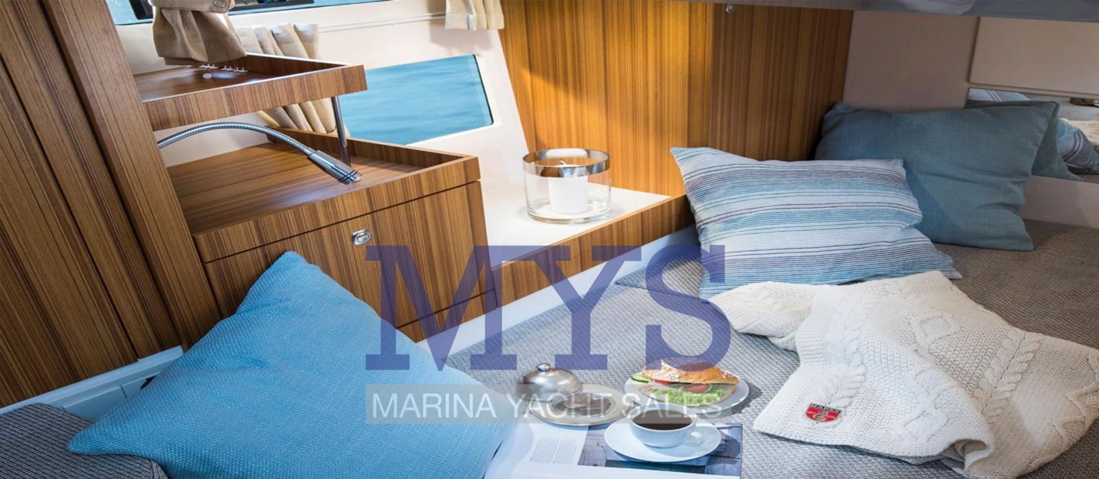 Le bateau dispose de nombreux aménagements sous le pont. La grande sensation d’espace est donnée par l’immense porte d’entrée, qui divise la zone du cockpit et le pont inférieur. Cela permet à la lumière naturelle de s’infiltrer dans la cuisine/le couloir et d’augmenter considérablement la sensation d’espace.