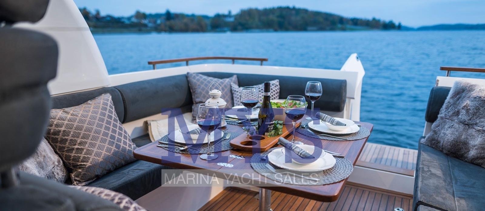 Alarme gaz, Alarme moteur, Eau sous pression, 3 Batteries (+1 385Ah), Chargeur de batterie (30A), Douche de cockpit, Propulseur d'étrave (4 cv), Hard top, Plateforme arrière (fissa), 2 Pompe de cale automatique, Porte latérale, Prise de quai, Echelle de bain, table de cockpit.