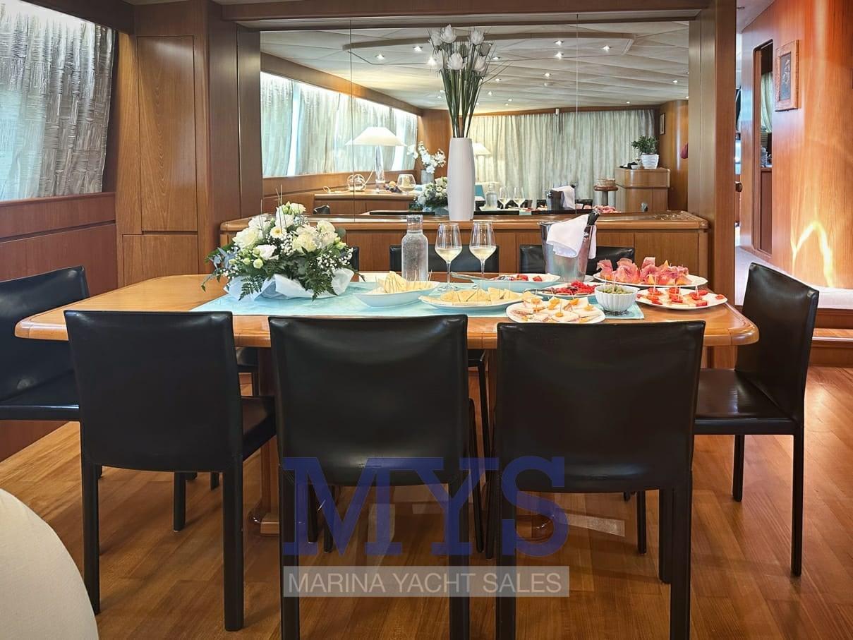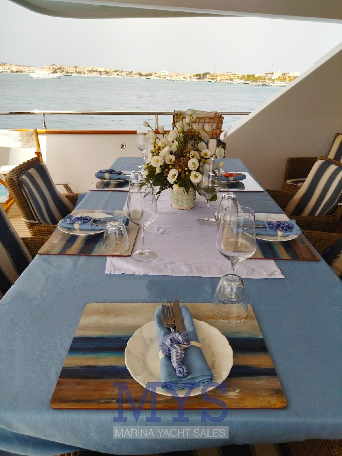 Les grands espaces du cockpit arrière, avec ses 7 mètres de large, abritent des canapés et des tables qui vous permettront de savourer les riches petits-déjeuners à bord ou vos déjeuners et dîners dans un confort absolu.