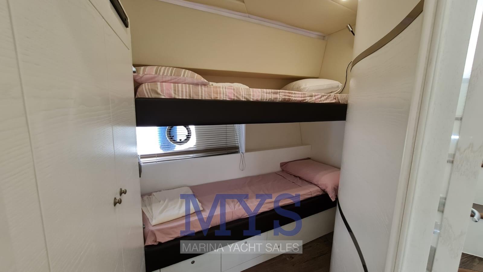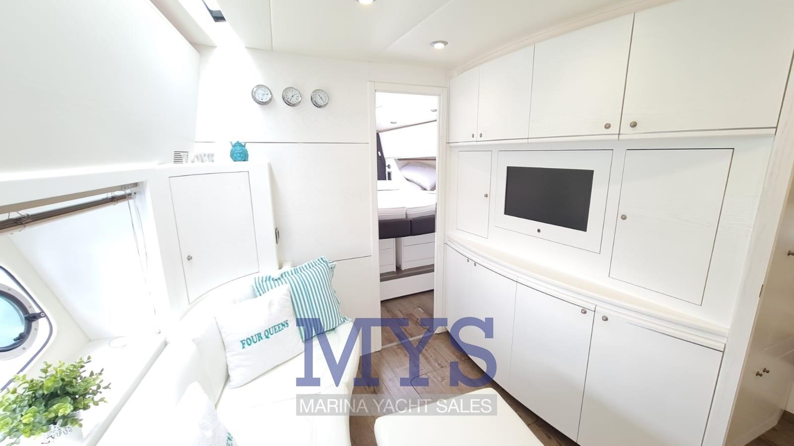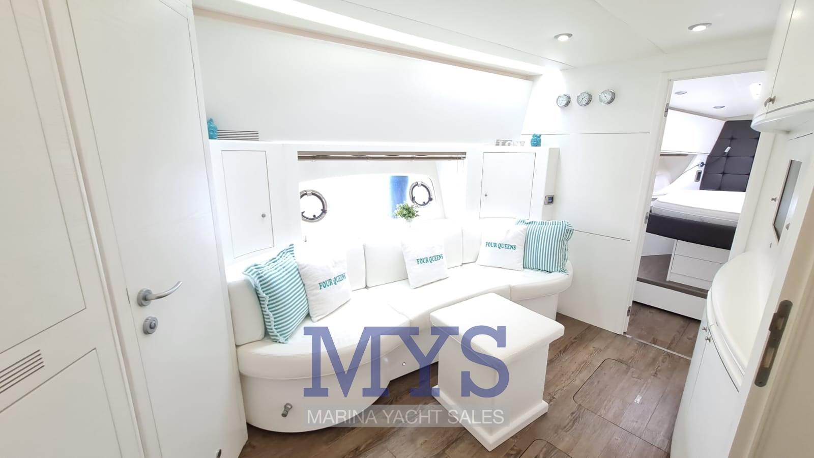 Dans le rouf, il y a le grand salon et le poste de barre. L’ameublement se caractérise par des matériaux nobles et des tissus selon le style désormais testé sur les modèles précédents.