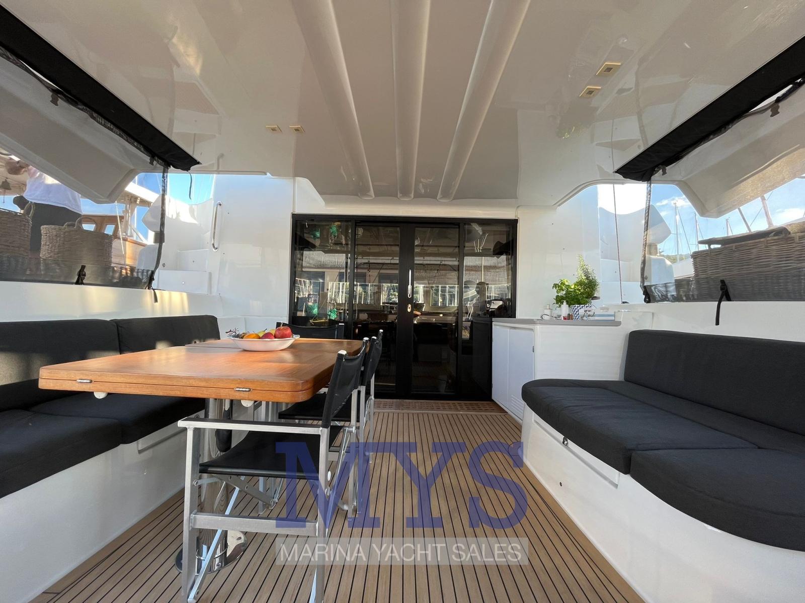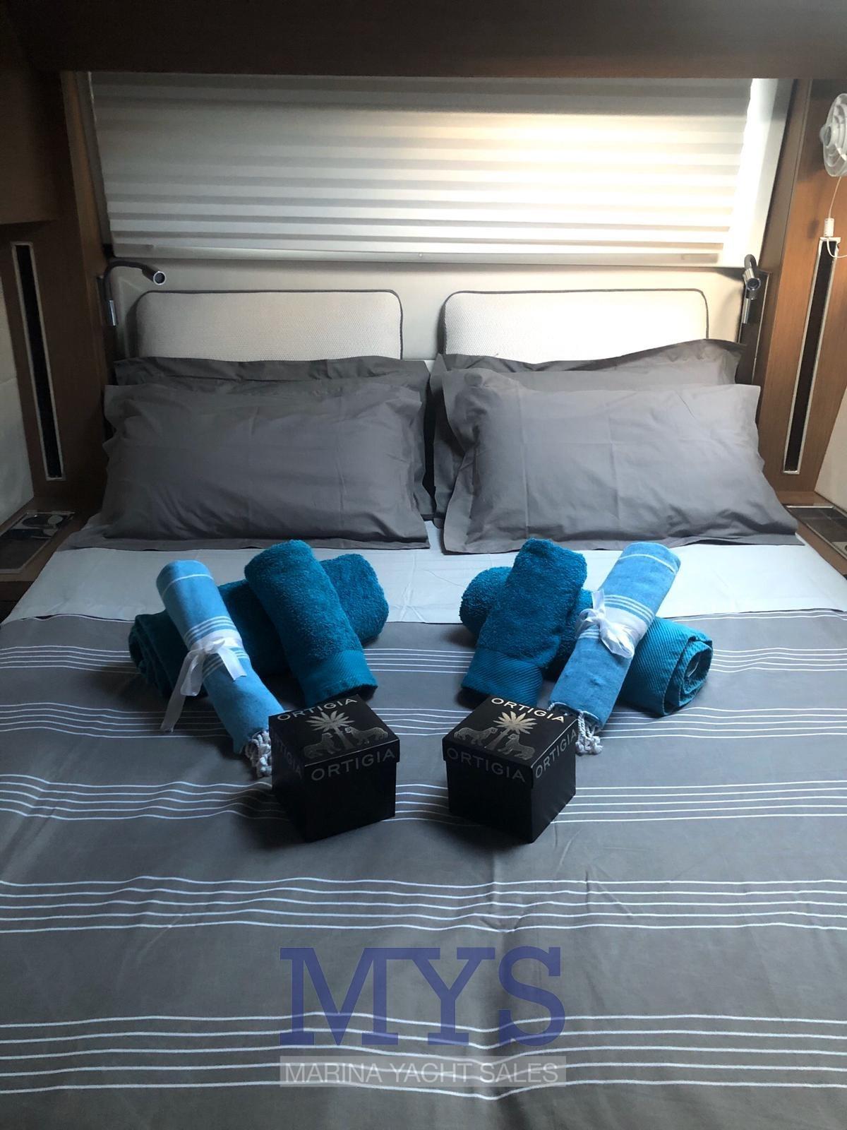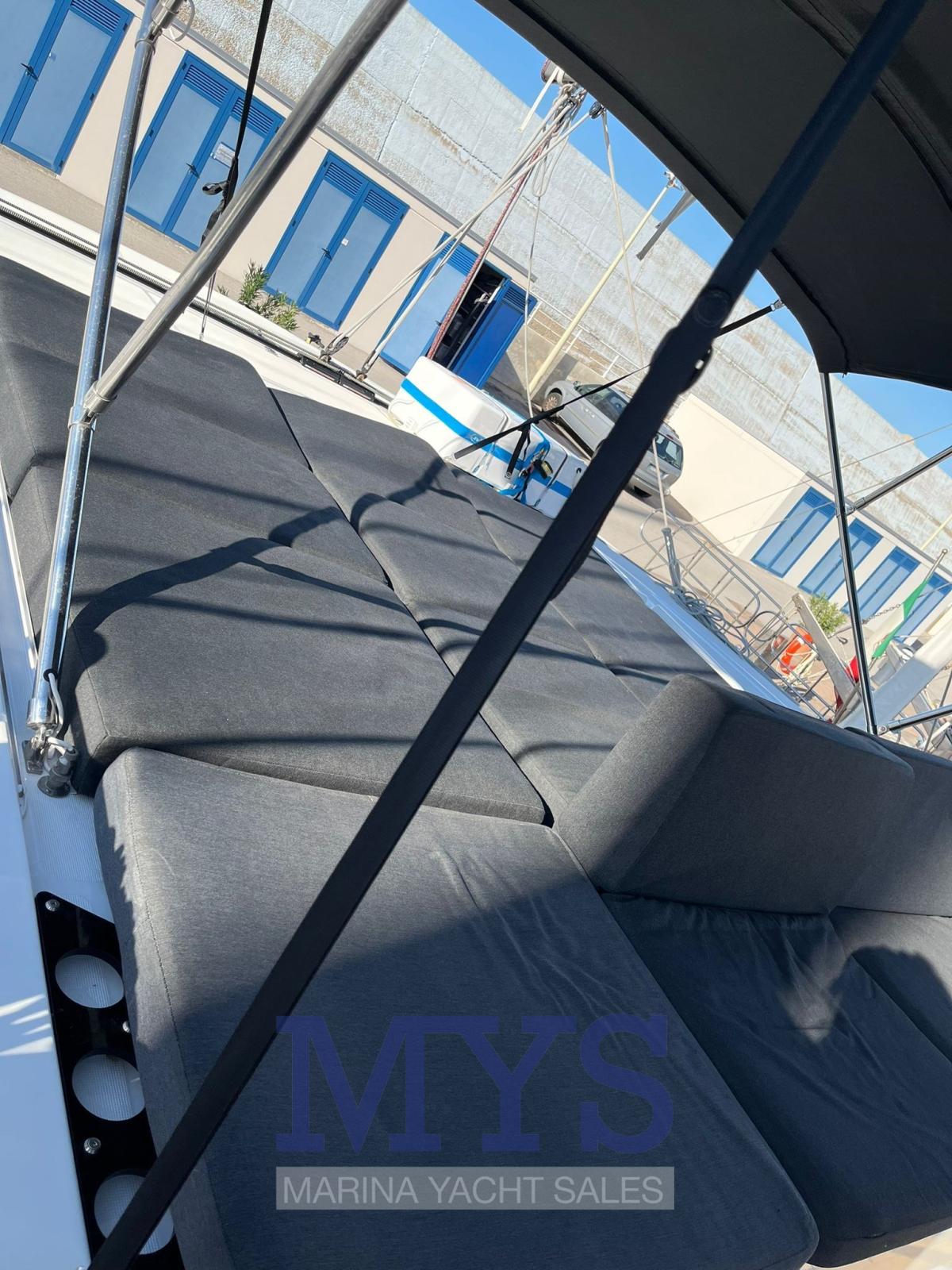 Flybridge avec deux accès sécurisés et une timonerie qui offre une visibilité parfaite ; Derrière, un immense espace modulable de détente dont les casiers, bien cachés, sont extrêmement grands pour ranger coussins. Un cockpit arrière ouvert sur la mer, des tableaux arrière spacieux et dégagés pour un accès facile à bord et une dînette modulable avec des sièges amovibles pour accueillir les petites et grandes familles.