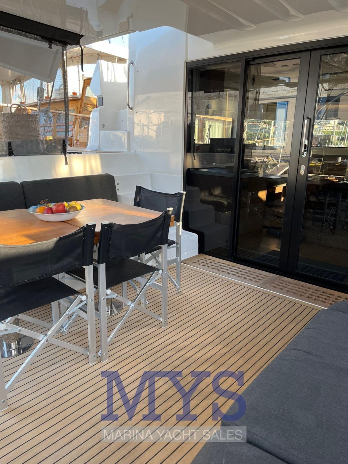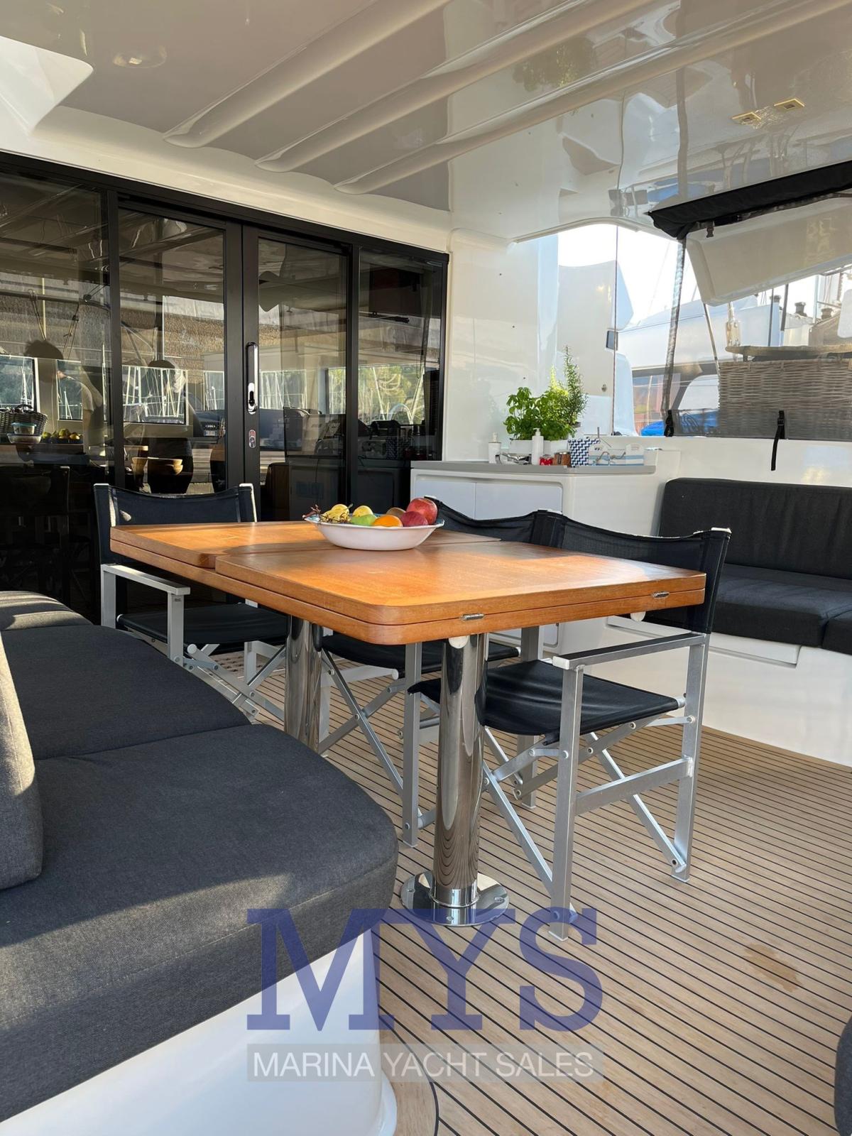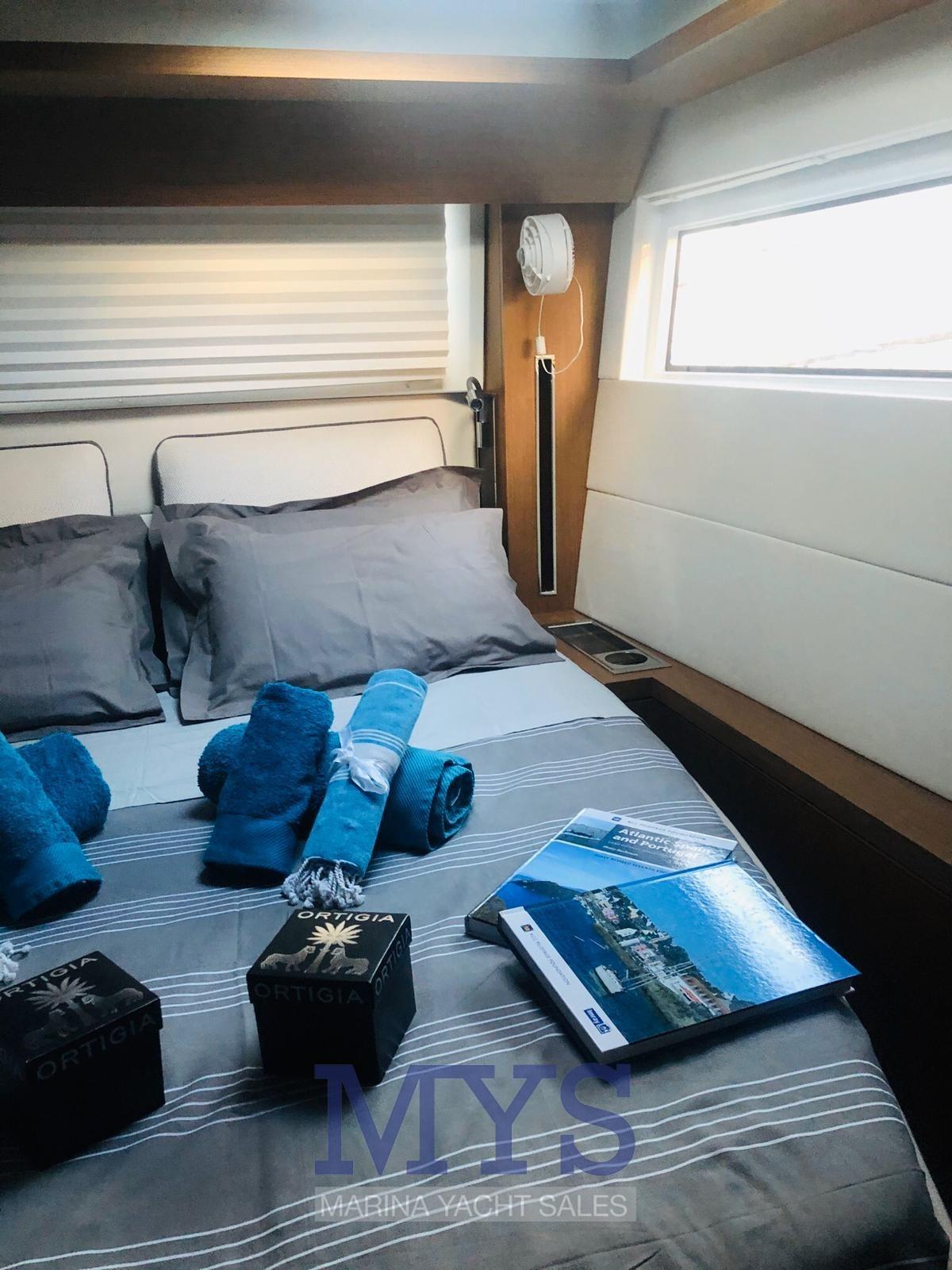 Flybridge avec deux accès sécurisés et une timonerie qui offre une visibilité parfaite ; Derrière, un immense espace modulable de détente dont les casiers, bien cachés, sont extrêmement grands pour ranger coussins. Un cockpit arrière ouvert sur la mer, des tableaux arrière spacieux et dégagés pour un accès facile à bord et une dînette modulable avec des sièges amovibles pour accueillir les petites et grandes familles.