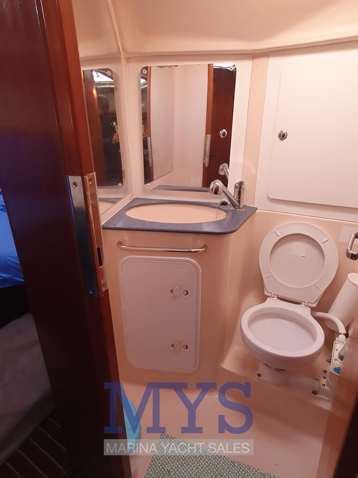 En entrant sous le pont, nous trouvons les deux cabines arrière. Sur le côté bâbord toilettes avec lavabo et douche et cuisine en pleine longueur. Sur le côté tribord la table à cartes, la dînette décapotable. A l’avant la cabine avec sa salle de bain.