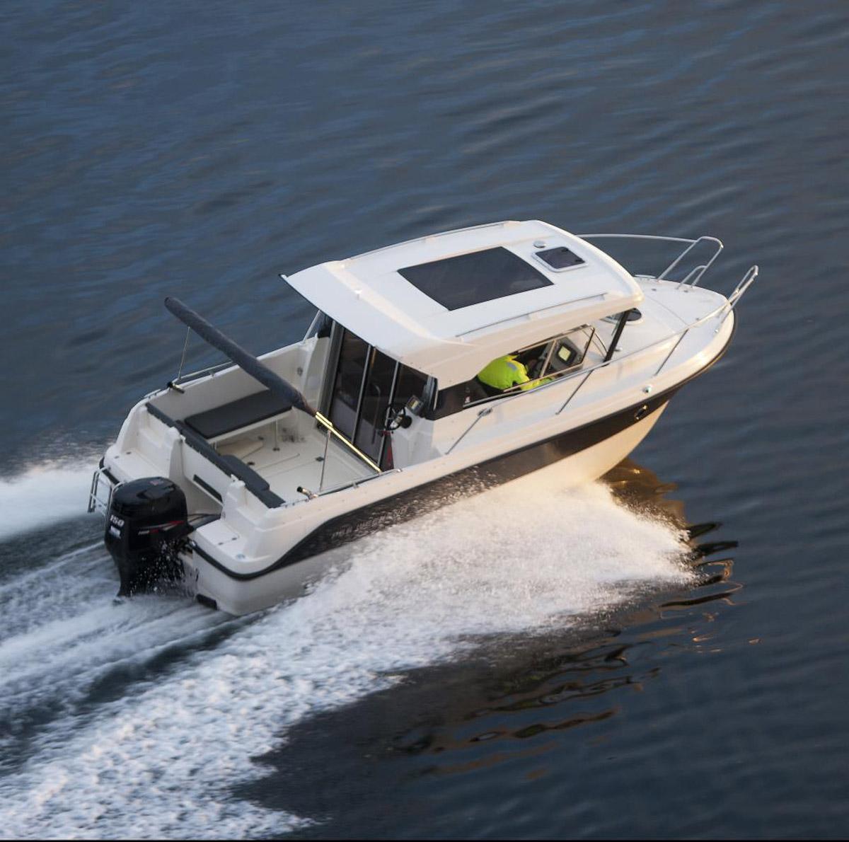 Le coin WC marin séparé assure une intimité et un confort à bord, tandis que la table à 4 places et la baie vitrée sur le toit apportent luminosité et ventilation à la cabine. Le pont arrière offre une banquette en U et suffisamment d'espace pour pratiquer la pêche ou se détendre.