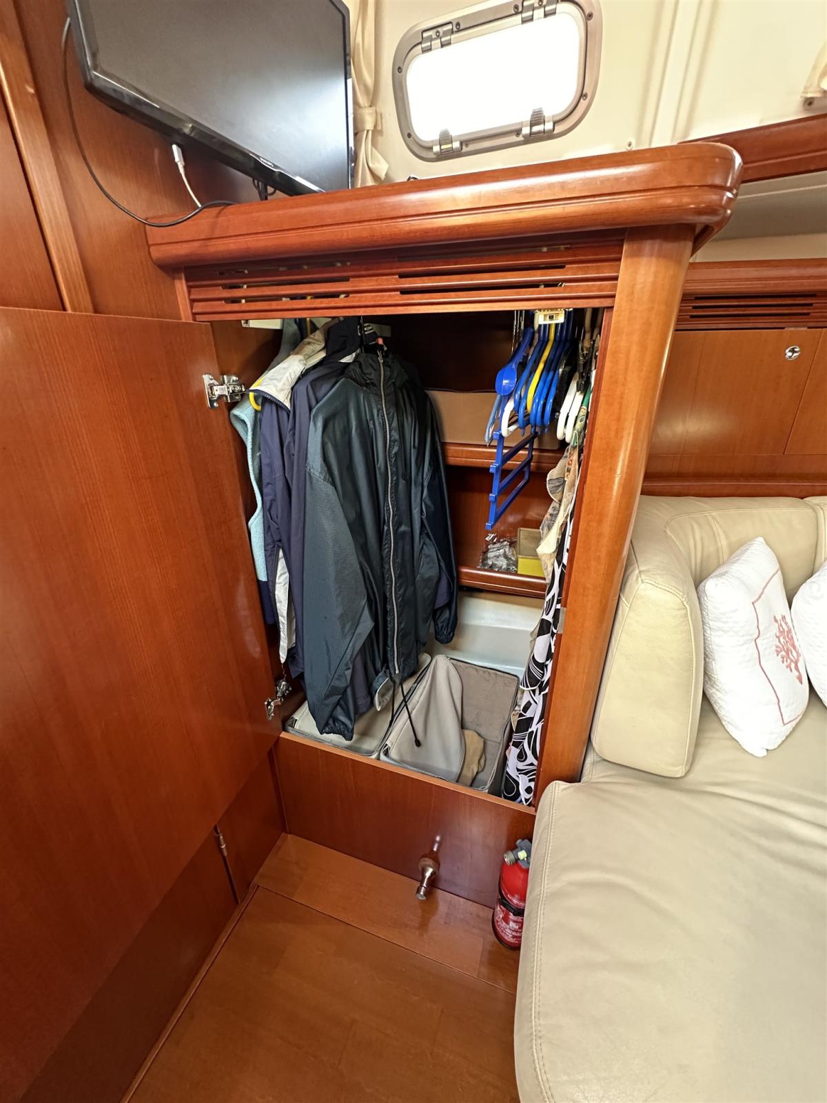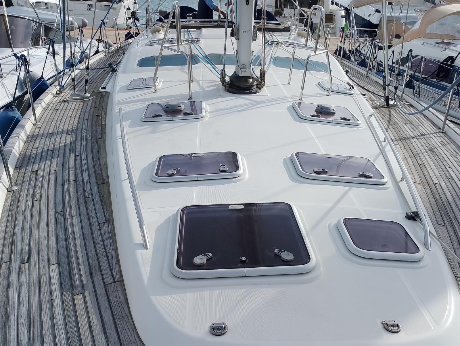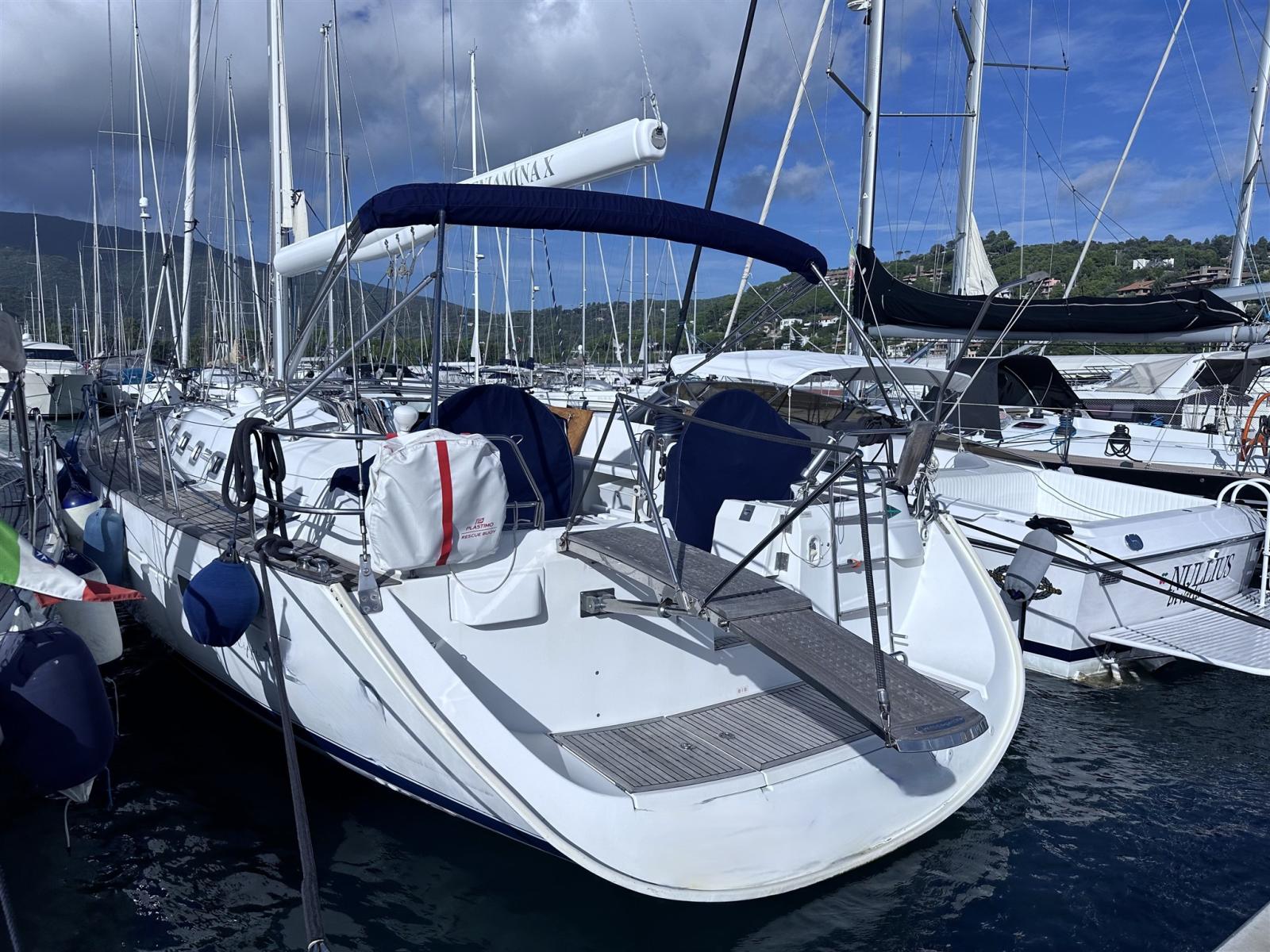 Eau sous pression, Système de vidange, Passavant en teck, Chargeur de batterie (80/A 40/A), Douche de cockpit, 2 Double barre à roue, Propulseur d'étrave (In tunnel), Bossoir pour HB, Éclairage de courtoisie, Moteur d'annexe (Yamaha), Passerelle (idraulica), Plateforme arrière, Pompe de cale automatique, Cockpit en teck, Prise de quai, Connexion eau sous pression à quai, Onduleur, Guindeau électrique (Comando anche alla timoneria), Gréement monotoron, Echelle de bain, Chaise support HB, table de cockpit, Annexe, Filières avec sortie latèrale, 4 Winch électrique (2 drizze 2 scotte), Windex.