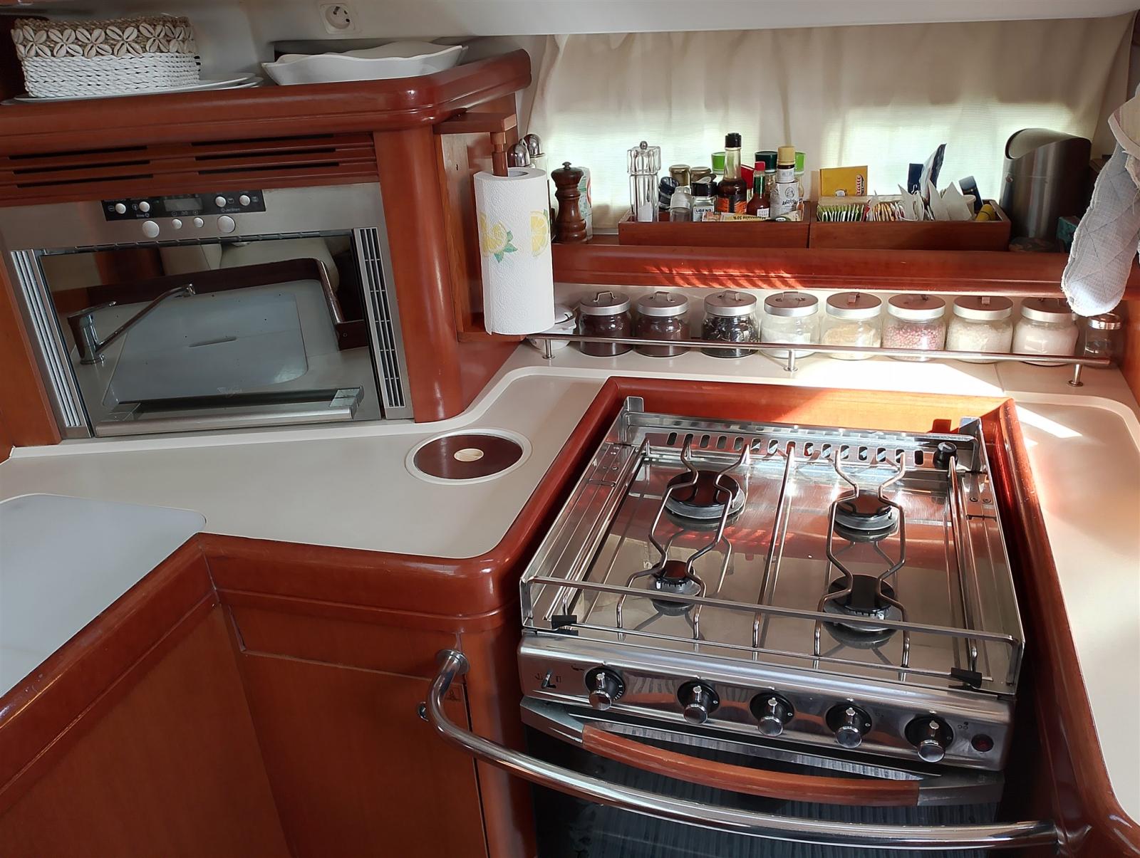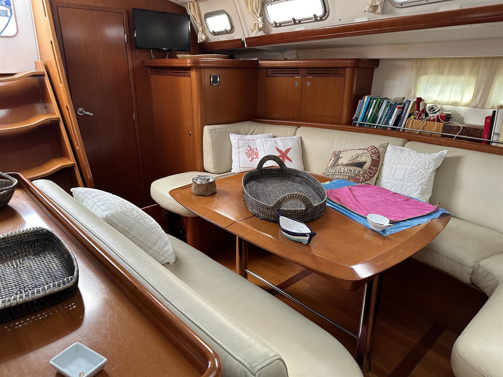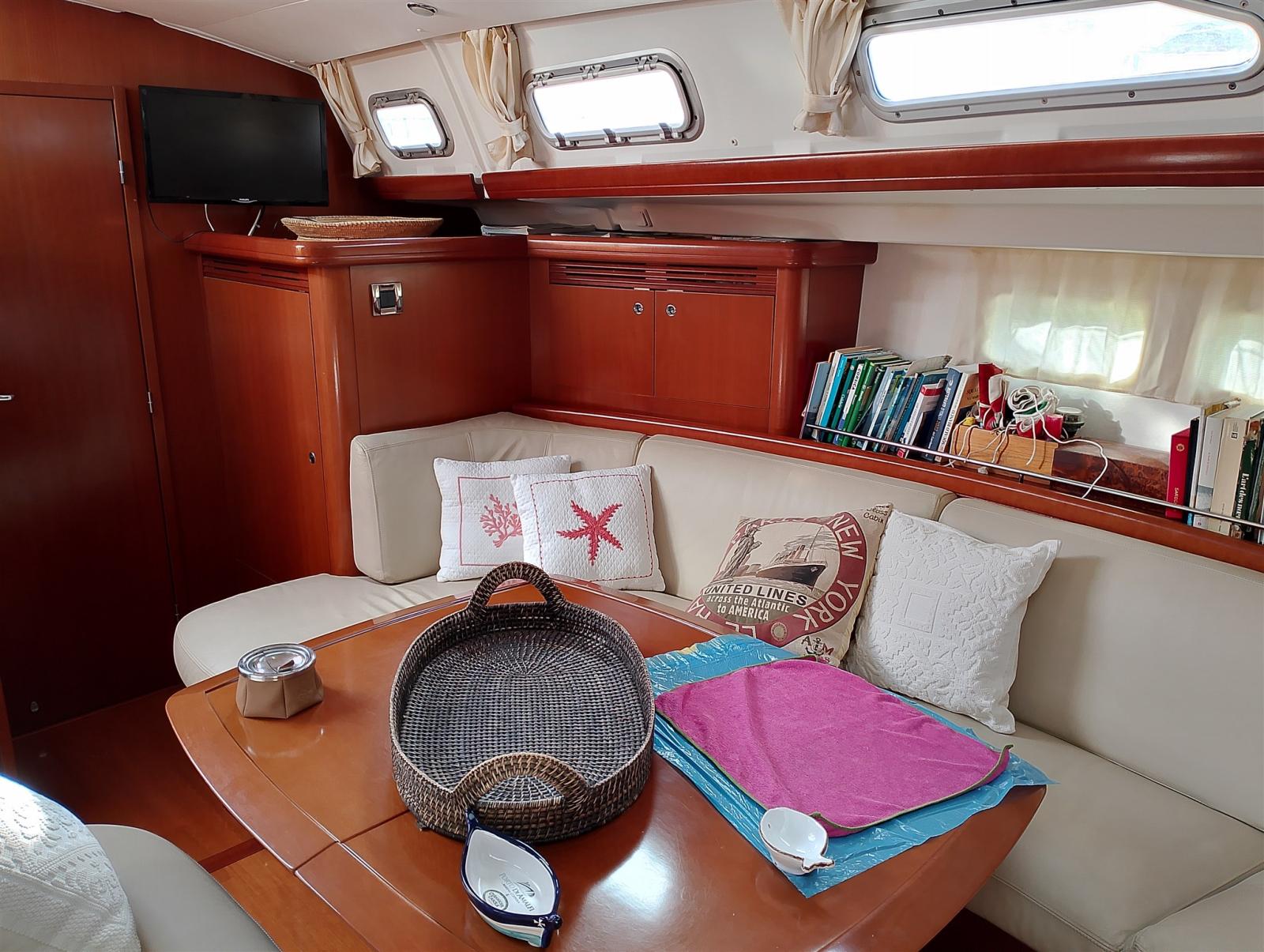 La poupe est ouverte au centre pour permettre l’accès à la plate-forme de bain. Il dispose d’une double timonerie et d’une belle table centrale qui permet, une fois ouverte, d’asseoir 6 personnes.