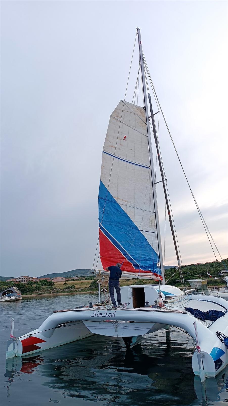 Le catamaran sur mesure de Crowther en matériau composite. Rouf relevable en 2 parties pour dinette et salle de bain et cuisine Dériveurs mobiles avec contrôle depuis le cockpit tels que les pales de gouvernail FB moteur dans un compartiment spécial ; Lever. De nombreuses voiles