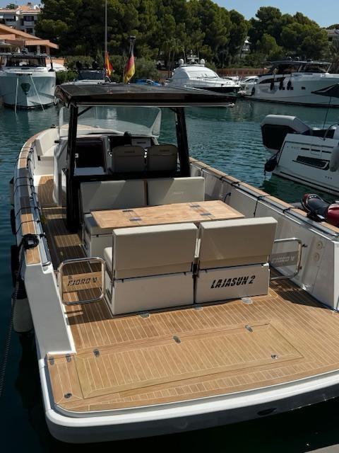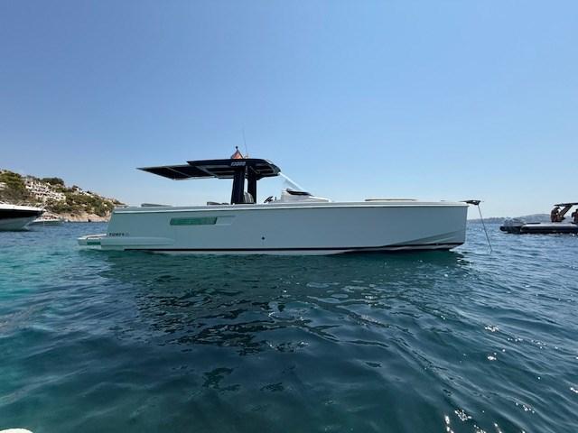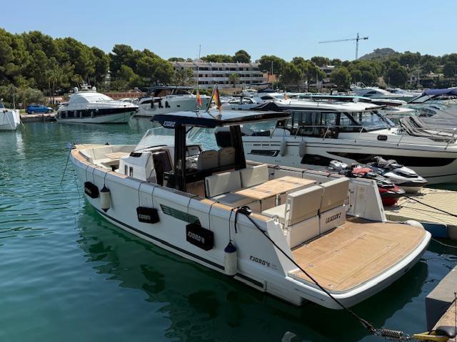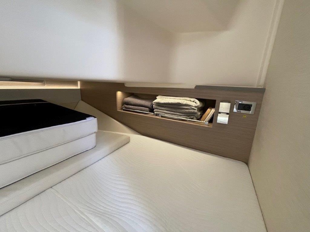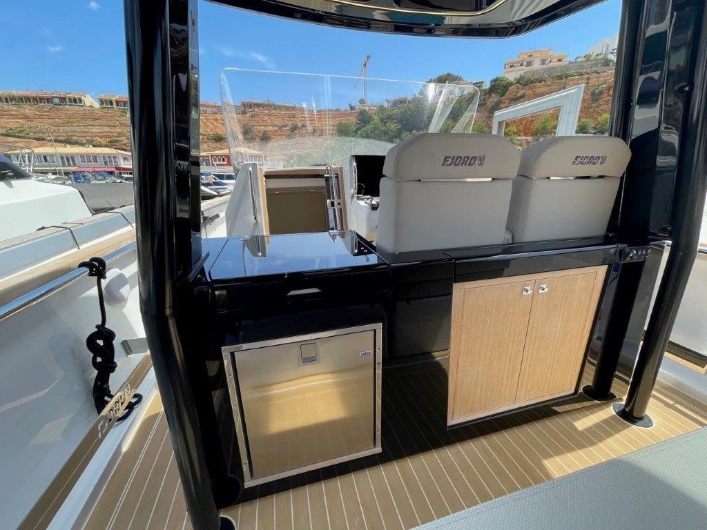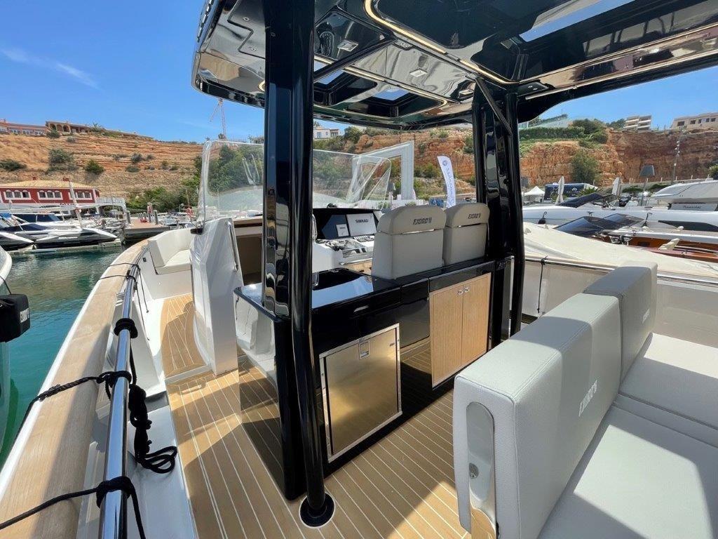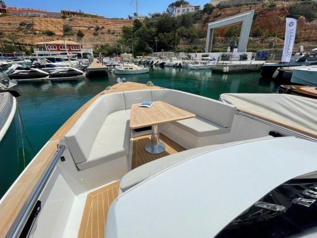 Alarme moteur, Alarme de pompe de cale, 2 Alternateur, Ancre (10 kg with 50 m chain), Ouverture du compartiment moteur électrique, Eau sous pression, Trim hydraulique, 5 Batteries (2x 90Ah (engine) + 3x 160Ah AGM (service)), 6 Taquets pliants, Système de vidange, Douche de cockpit, Extincteur(s) fixe(s) (Automatic Firebuoy system), Lavabo dans le cockpit, 6 Défenses, Plateforme arrière (fixed swimming platform), 2 Pompe de cale automatique, Pont en teck (synthetic), Porte latérale (Sliding), Prise de quai, Guindeau électrique, Echelle de bain, 2 table de cockpit (with electric pedestal convertible into sunpad fwd and aft), 2 Filières avec sortie latèrale (aft), Corne, T-Top (painted tubular steal and fiberglass).