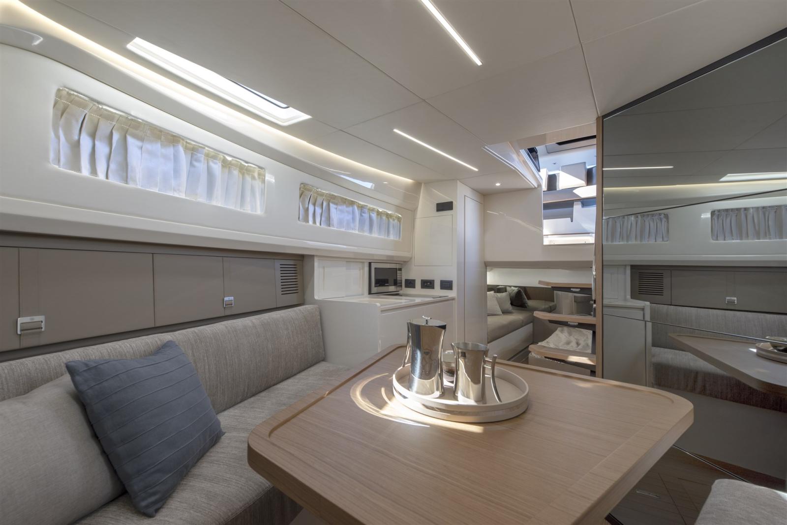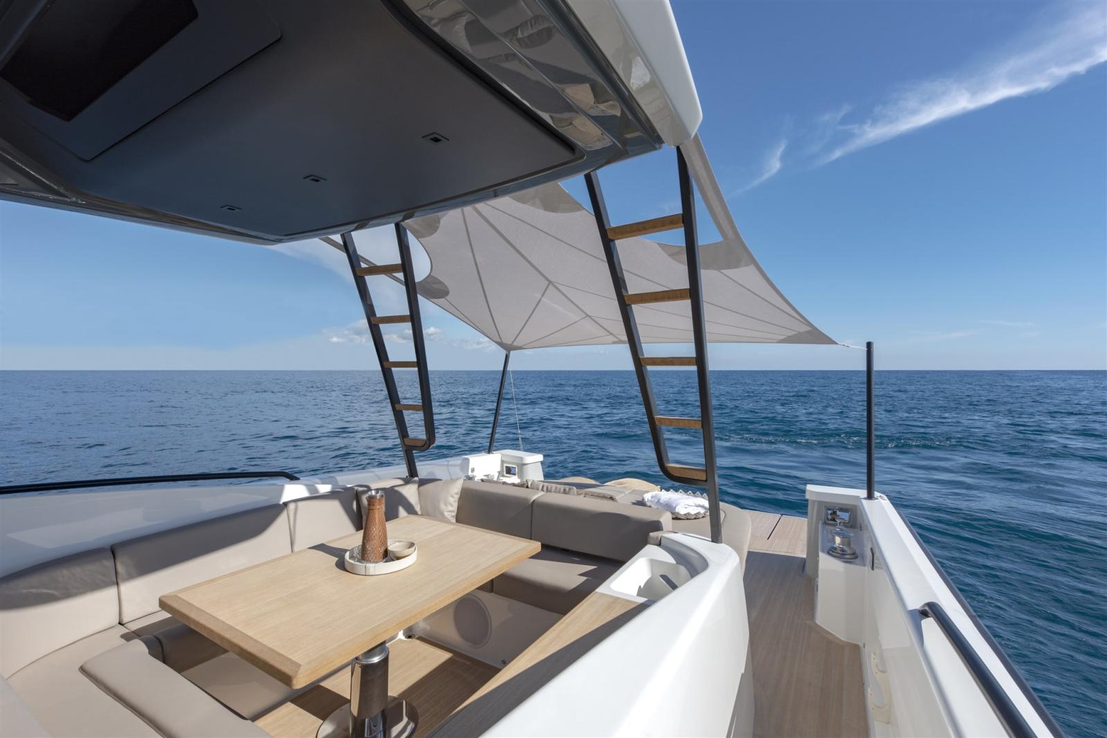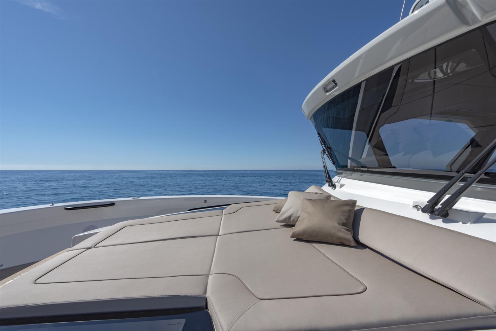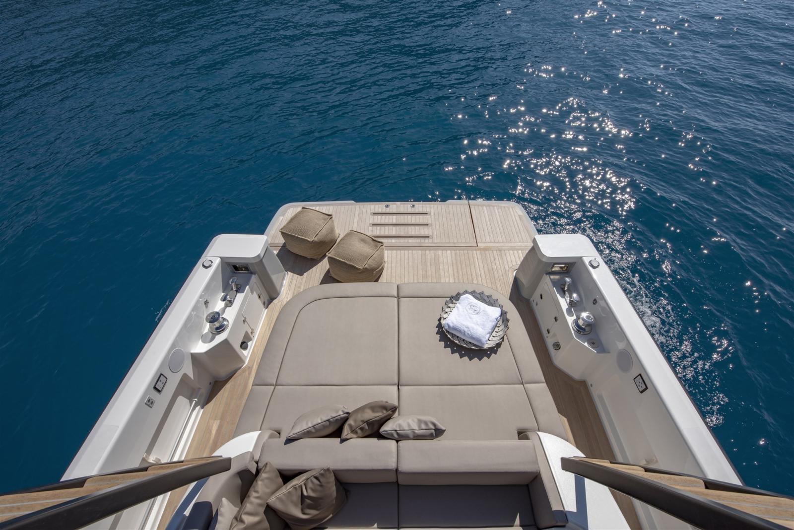Alarme gaz, Alarme de pompe de cale, Ancre (15 kg SS Bruce type with 75m galvanized chain 8mm), Ouverture du compartiment moteur électrique, Auto Dynamic Trim Interceptor, Eau sous pression, 4 Batteries (For generator, engines and service), 2 Taquets pliants (mid ship + 4 fixed), Système de vidange, Passavant en teck, Chargeur de batterie (50 Ah), Douche de cockpit, Phares fixes arrière (Front and front docking lights), Phare de poursuite (with RC), Flaps électriques (Trim Tabs), Hard top (Full carbon fiber wiht 2 ladders to sundeck), Extincteur(s) fixe(s), Indicateurs de flaps, Lavage de chaine, Lavabo dans le cockpit, Éclairage de courtoisie, 2 Spots sous-marins, Passerelle (hydraulic), Plateforme arrière (with 400 kg hydraulic tender lift), 4 Pompe de cale automatique, Porte latérale (sliding), Cockpit en teck, Prise de quai (16 Ah with 15m cable), Guindeau électrique (1.000 W), Echelle de bain, Stabilisateurs (gyroscopic Seakeeper 3), table de cockpit (Electric telescopic), Table pliante de salon (Electric telescopic), Corne, 2 Winch électrique arrière, Winch électrique avant.