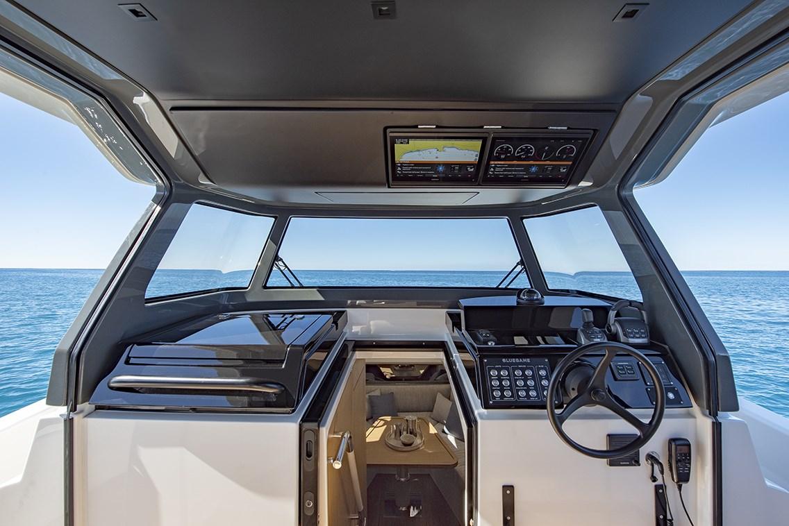 AIS (Garmin transceiver), Indicateur d'angle de barre, Commande électrique (Volvo Penta EVC), DSC VHF (Garmin), Joystick (Volvo Penta), Pilote automatique (Garmin), 2 Lecteur de cartes (Multifunctional Garmin 12’’ display), Siège copilote.