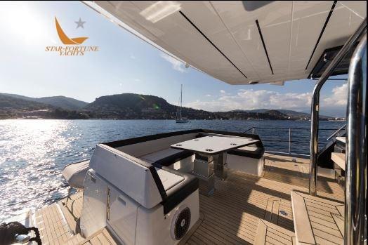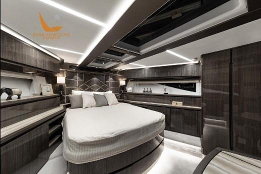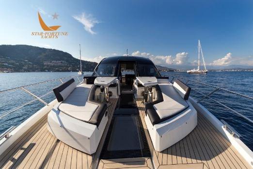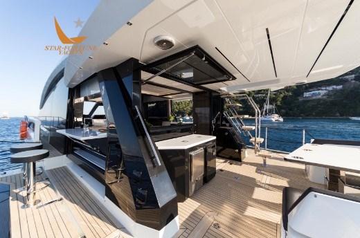 À l’extérieur, la salle à manger du cockpit arrière accueille huit personnes qui peuvent profiter d’un système de divertissement avec une télévision à écran plat qui coulisse depuis le haut de la cuisine, le tout protégé des intempéries par le parasol électrique arrière. Plus en arrière, vous trouverez la plate-forme de bain hydraulique qui peut gérer tous les accessoires d’eau et un accès pratique à une cabine de skipper surdimensionnée. Le pont supérieur offre trois sièges sport et un solarium pour les loisirs, tandis que la zone du pont avant est accessible depuis l’entrée révolutionnaire de la fenêtre avant électrique qui révèle deux canapés mobiles séparés avec des tables pliantes intégrées pour le solarium.