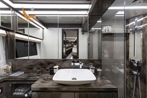 Aménagement : 3 cabines avec salle de bain + 1 marin - ou 4 cabines + 1 marin.