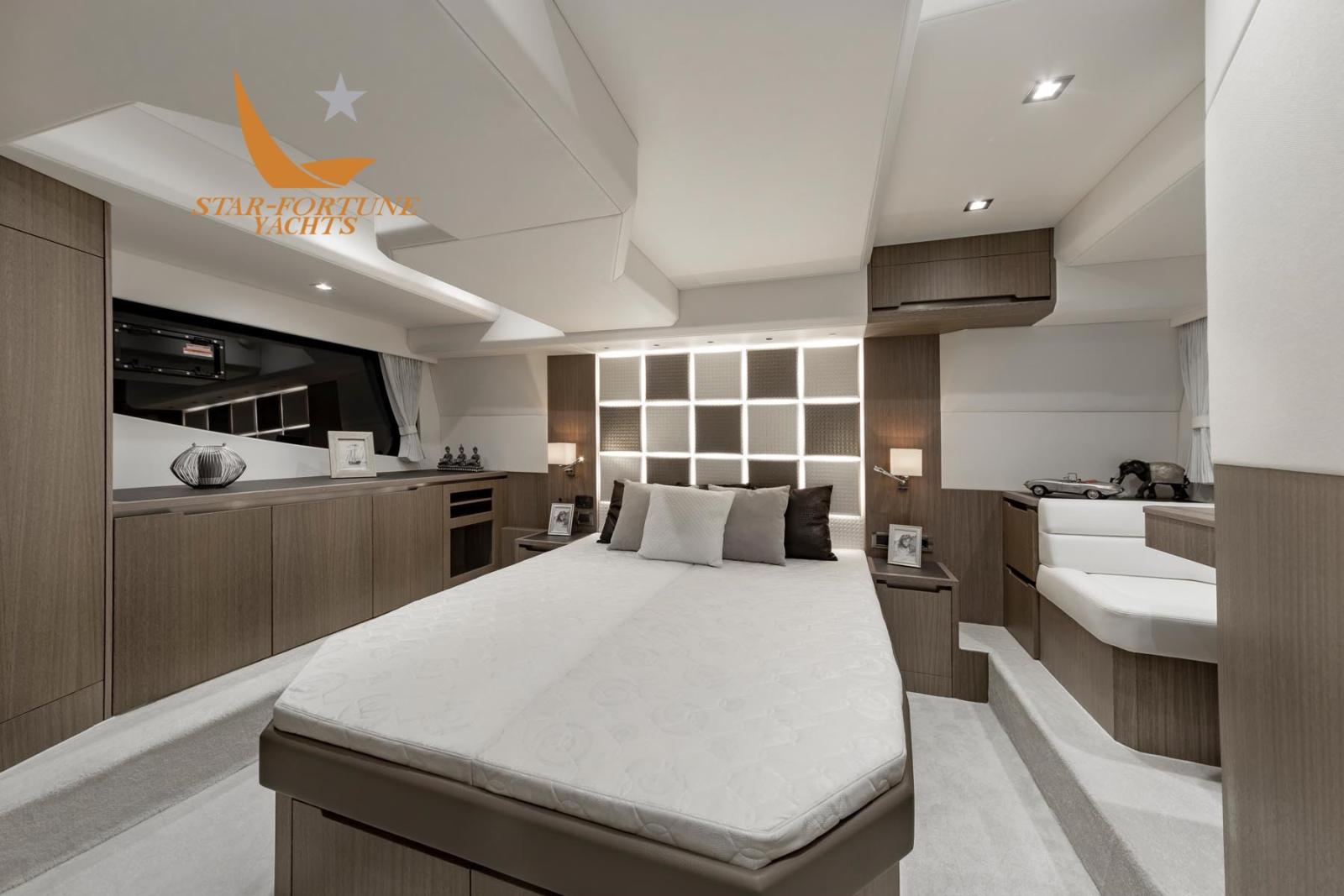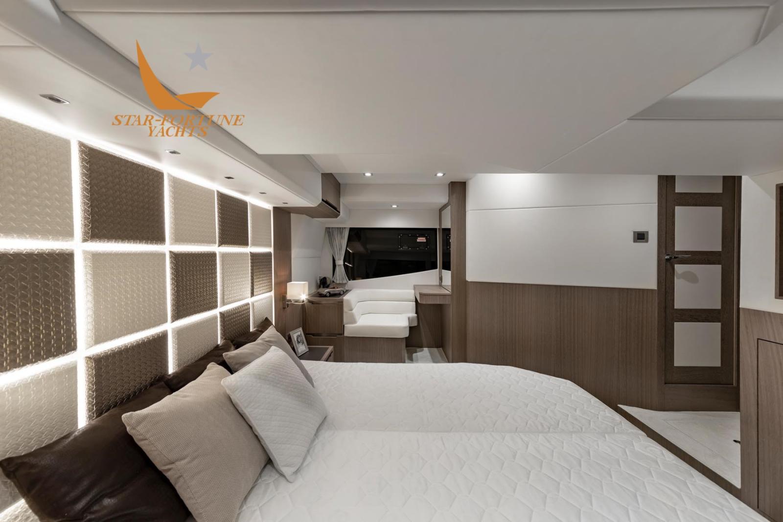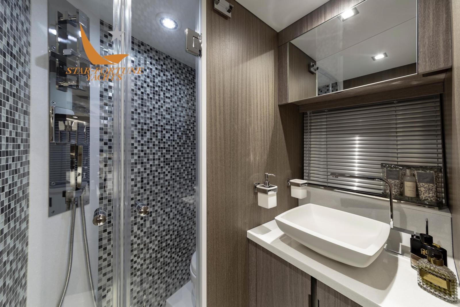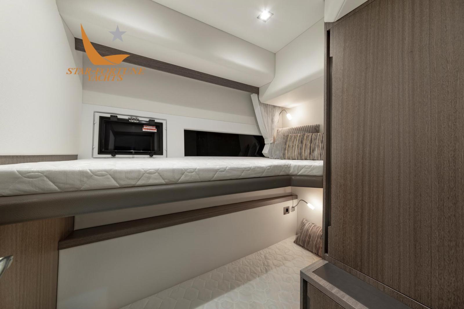En dessous, trois cabines et deux salles de bains attendent les clients. Les cabines d’invités offrent un lit double à l’avant et des lits superposés à tribord. La cabine du propriétaire est située au milieu du navire avec une salle de bain attenante pour plus d’intimité.