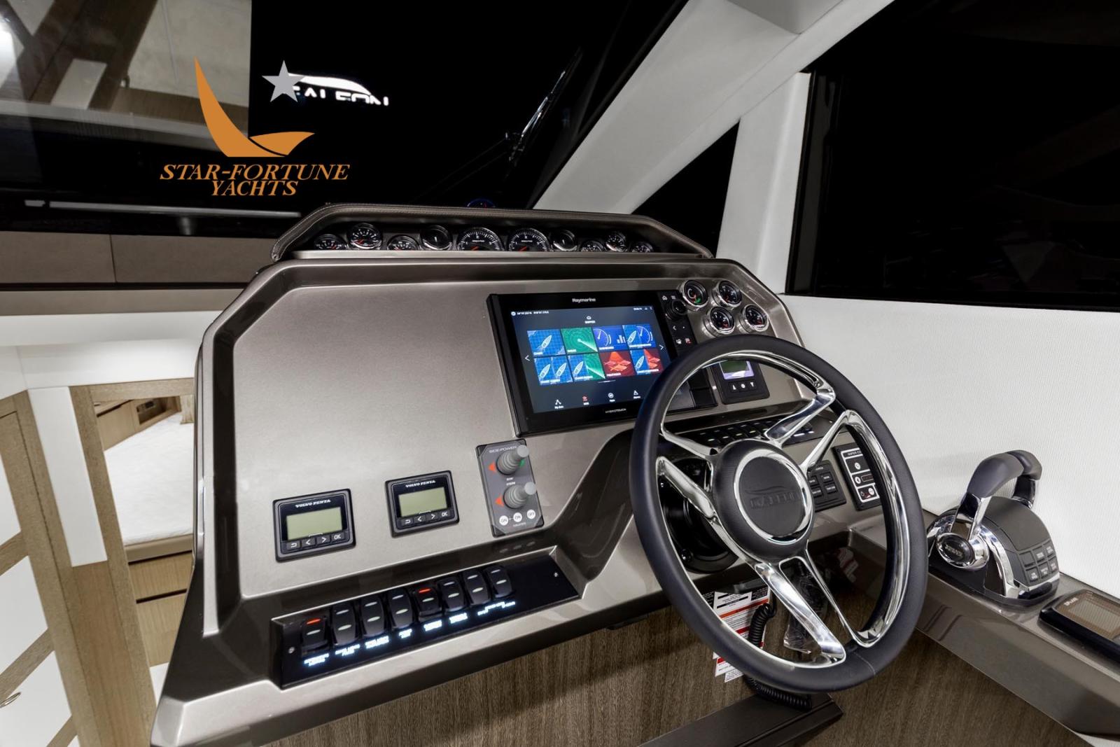 Alarme moteur, Alarme de pompe de cale, Eau sous pression, 6 Batteries, Douche de cockpit, Flaps hydrauliques, Hard top, Extincteur(s) fixe(s), Indicateurs de flaps, Porte latérale, Cockpit en teck, Prise de quai, Connexion eau sous pression à quai, Guindeau électrique, Echelle de bain.