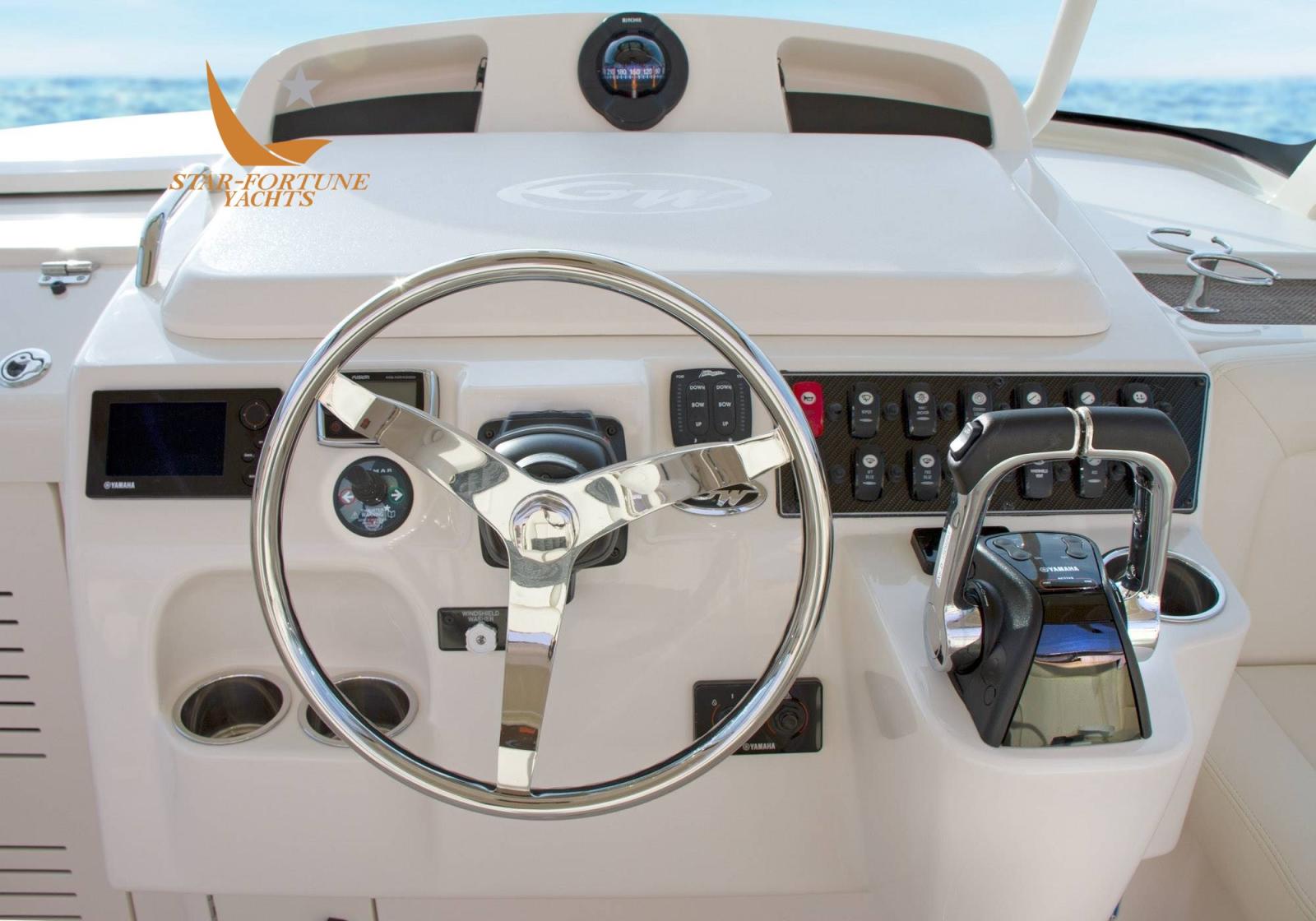 Alarme gaz, Alarme moteur, Alarme de pompe de cale, Eau sous pression, 4 Batteries, Douche de cockpit, Flaps hydrauliques, Extincteur(s) fixe(s), Éclairage de courtoisie, Porte latérale, Prise de quai, Connexion eau sous pression à quai, Onduleur, Guindeau électrique, Echelle de bain, Corne, T-Top, Winch électrique avant.