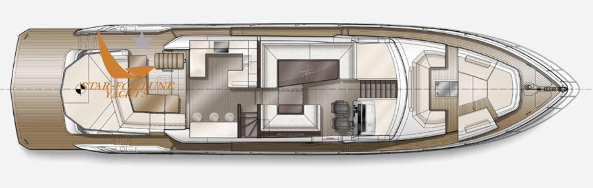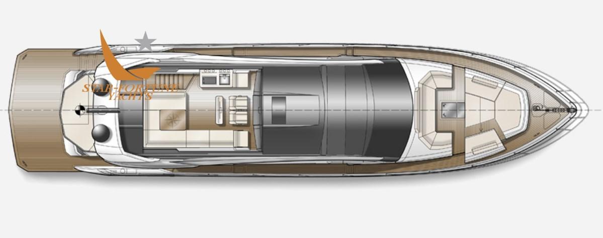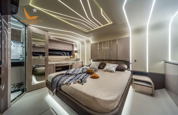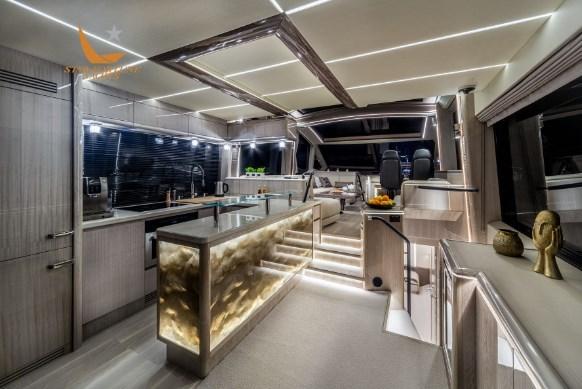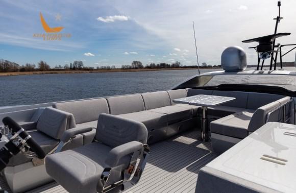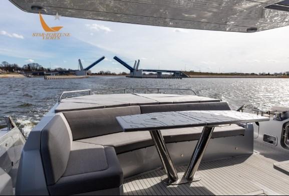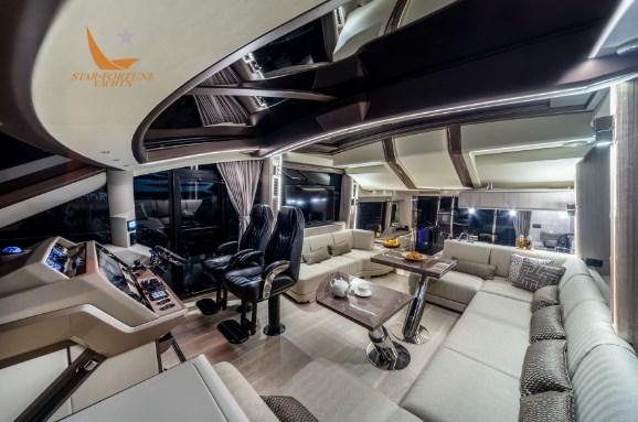 Les passagers apprécieront certainement les grands passavants latéraux qui permettent d’accéder en toute sécurité à la zone de loisirs de la proue qui s’ouvre en glissant sur simple pression d’un bouton. Notez le toit ouvrant en verre au-dessus du poste de pilotage et les grands panneaux de verre à bâbord et à tribord qui se rétractent rapidement, ouvrant ainsi l’ensemble du salon. Le pont supérieur est équipé de deux sièges sport, d’un bar et d’un grand coin salon.