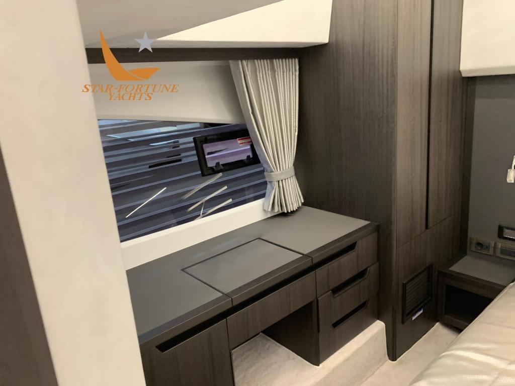 Alarme gaz, Alarme moteur, Alarme de pompe de cale, Ouverture du compartiment moteur électrique, Auto Dynamic Trim Interceptor, Eau sous pression, Trim hydraulique, Taquets pliants, Système de vidange, Passavant en teck (opzionale), Chargeur de batterie (opzionale), Couleur spéciale (opzionale, verniciatura a polvere o gelcoat), Douche de cockpit, Propulseur de poupe (opzionale), Phares fixes arrière, Flaps hydrauliques, Garage à annexe, Bossoirs pour annexe, Hard top, Extincteur(s) fixe(s), Indicateurs de flaps, Lavabo dans le cockpit, Éclairage de courtoisie, Spots sous-marins (opzionale), Passerelle (opzionale), Plateforme arrière (idraulica opzionale fissa di serie e con scaletta da bagno), Pompe de cale automatique, Pompe de cale manuelle, Porte latérale, Cockpit en teck (opzionale), Prise de quai, Connexion eau sous pression à quai, Guindeau électrique, Echelle de bain, Système de filtration des eaux usées, Stabilisateurs (opzionale (zipwake)), table de cockpit, Table pliante de salon, Filières avec sortie latèrale, Corne, Pont en teck (opzionale), Winch électrique arrière, Winch électrique avant.