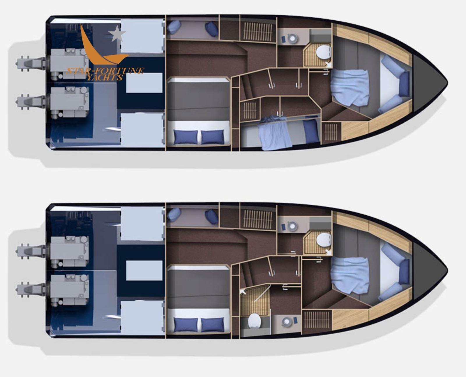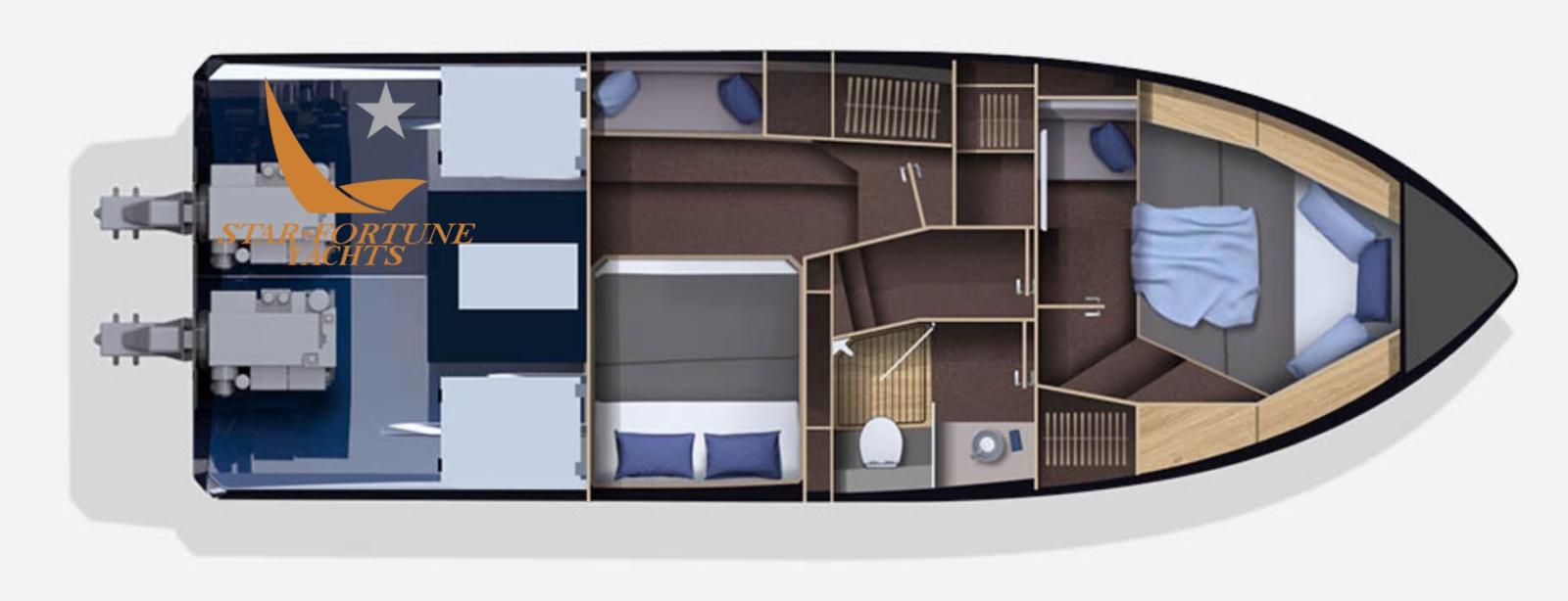 le HTC 370 dispose de trois cabines et d’une salle de bain. Il est dans la catégorie bateau car la coque ne dépasse pas 10 mètres.