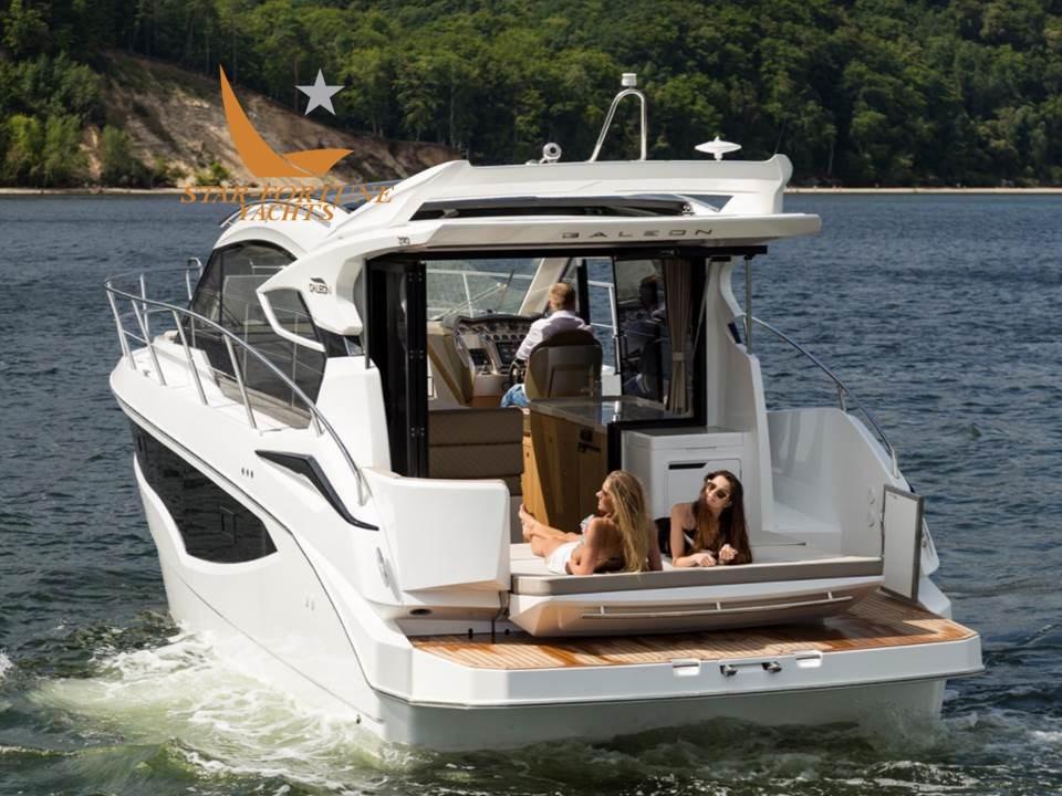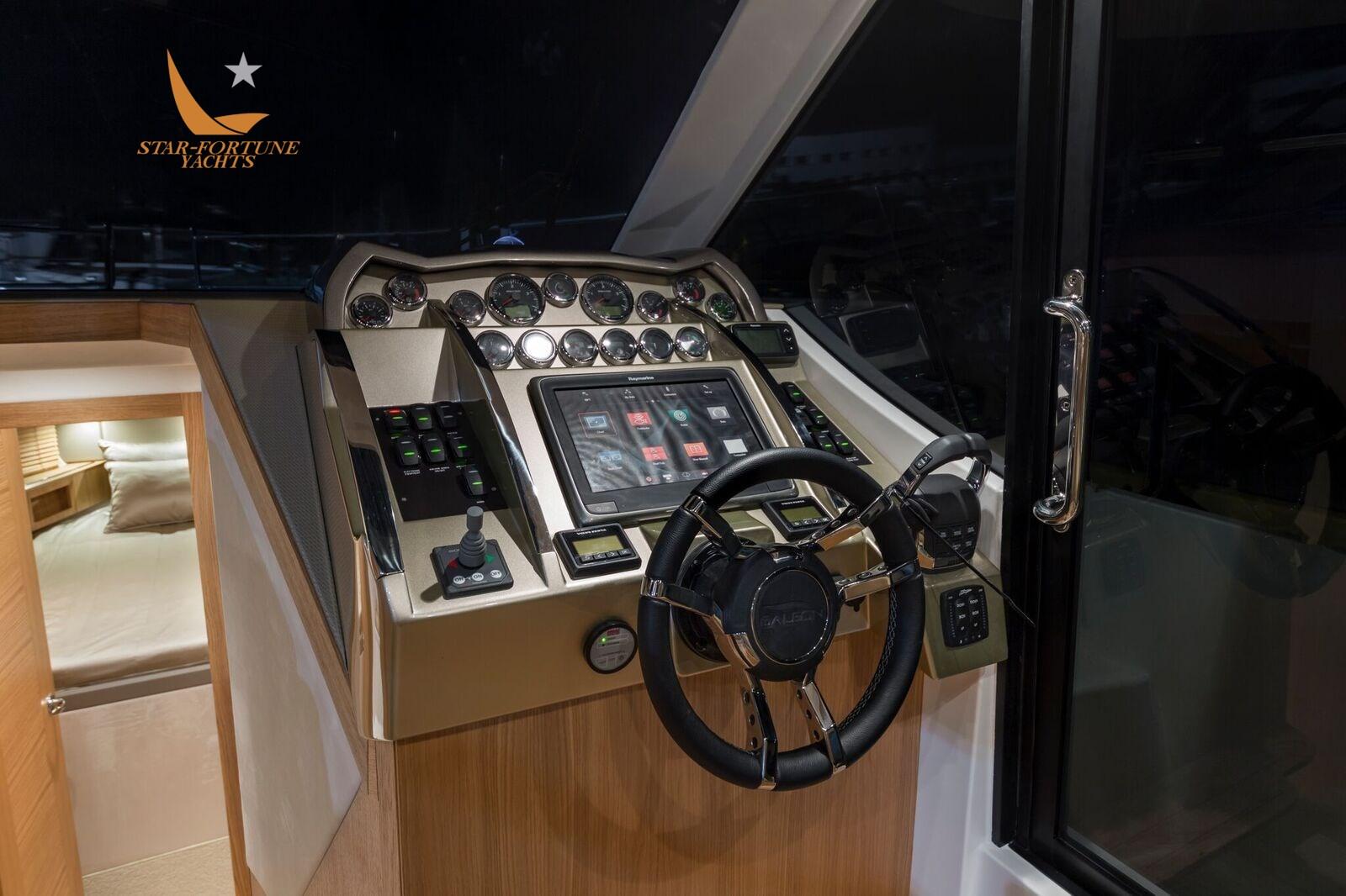 Alarme moteur, Eau sous pression, Douche de cockpit, Flaps hydrauliques, Hard top, Extincteur(s) fixe(s), Plateforme arrière, Pompe de cale automatique, Pompe de cale manuelle, Cockpit en teck, Prise de quai, Guindeau électrique, Echelle de bain, table de cockpit.