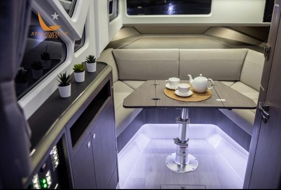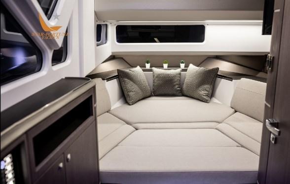 Canapé 4 places avec dossier convertible avec table amovible et réglable. Le plancher du cockpit à la proue est recouvert de pont souple tandis que le