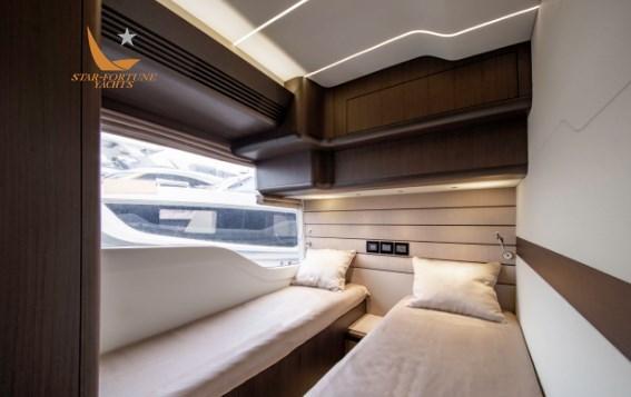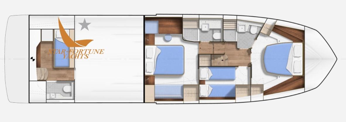 En dessous, trois cabines et deux salles de bains attendent les passagers pour un total de six lits. Les quartiers du propriétaire sont situés au milieu du navire avec beaucoup d’espace de rangement et une salle de bain privée avec douche. L’espace VIP à l’avant offre un grand lit double.