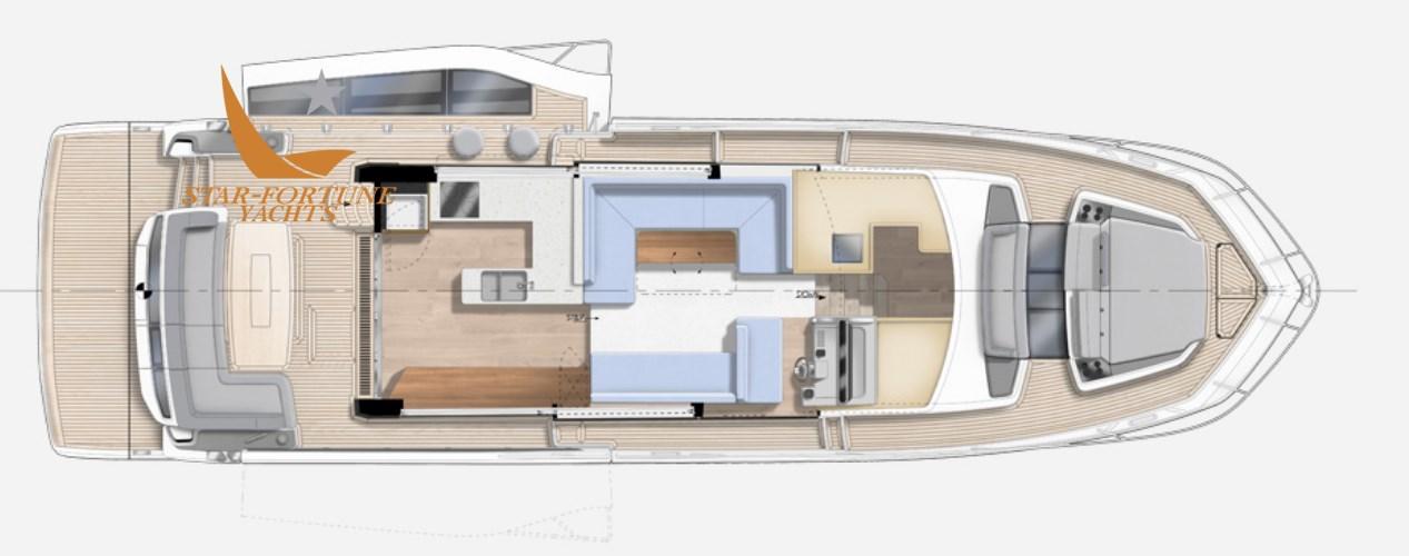 L’extérieur est mis en valeur par l’abondance d’espace sur les deux ponts et une pléthore de fenêtres qui promettent des intérieurs bien éclairés. Sur le pont supérieur, les clients trouveront deux zones de repos et de restauration en forme de U, opposées - combinez-les pour une expérience culinaire en plein air parfaite ! À l’avant, trouvez un coin salon et le poste de pilotage supérieur avec le bar et le grill reculés. La grande zone en porte-à-faux est équipée d’un espace ininterrompu pour les loisirs et les activités et peut être occupée par deux chaises longues autoportantes. Cette approche flexible de la distribution de l’espace vous permet de vous reposer pendant la journée et de divertir les invités le soir.