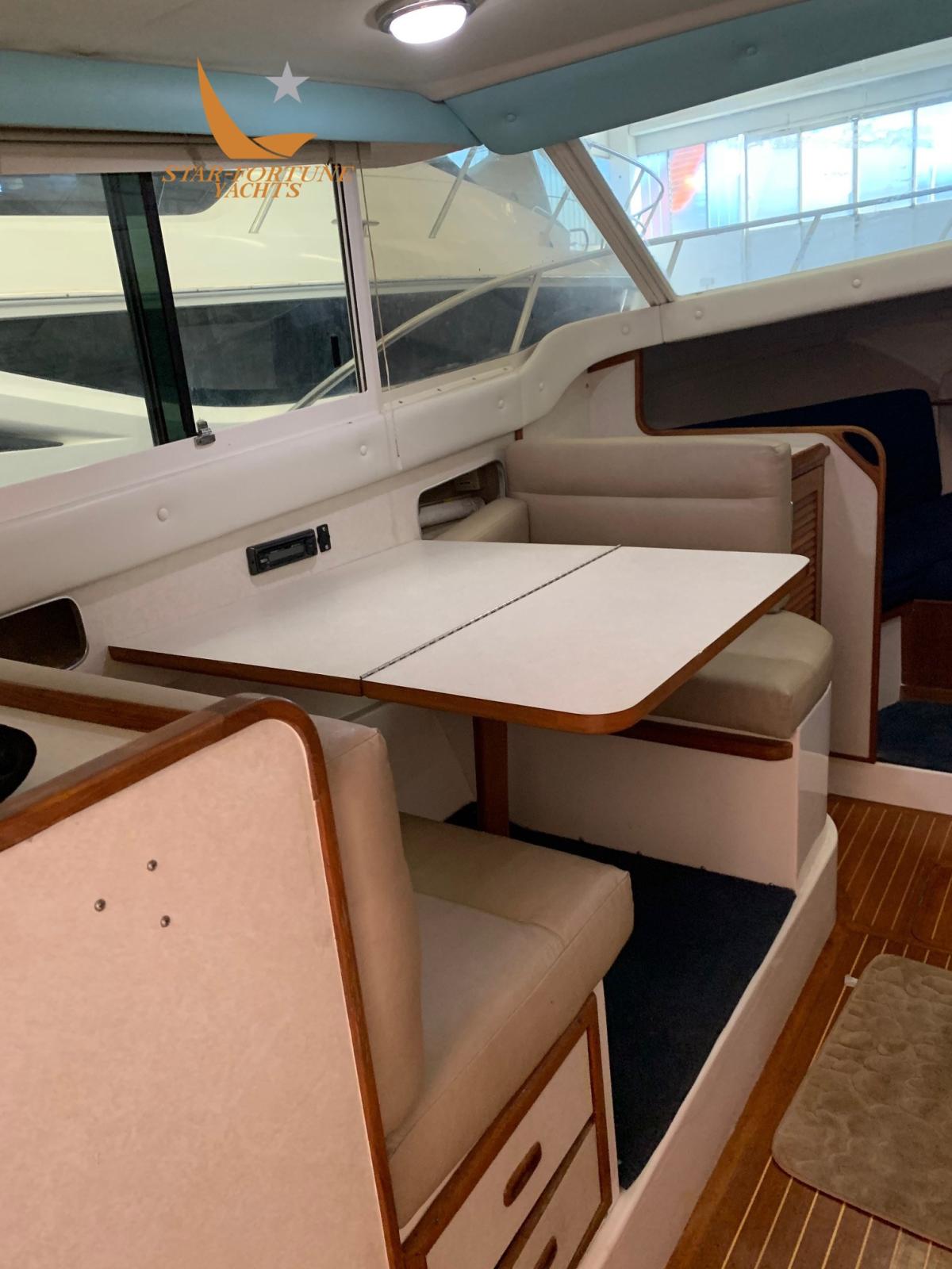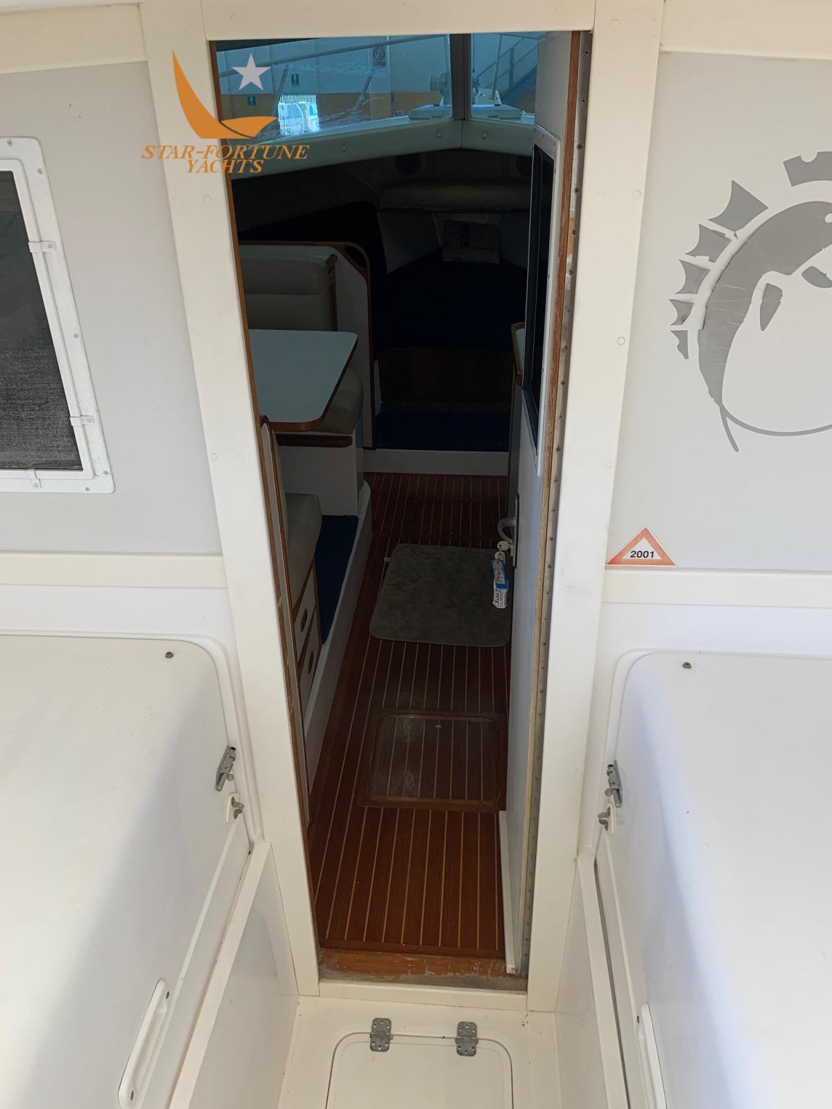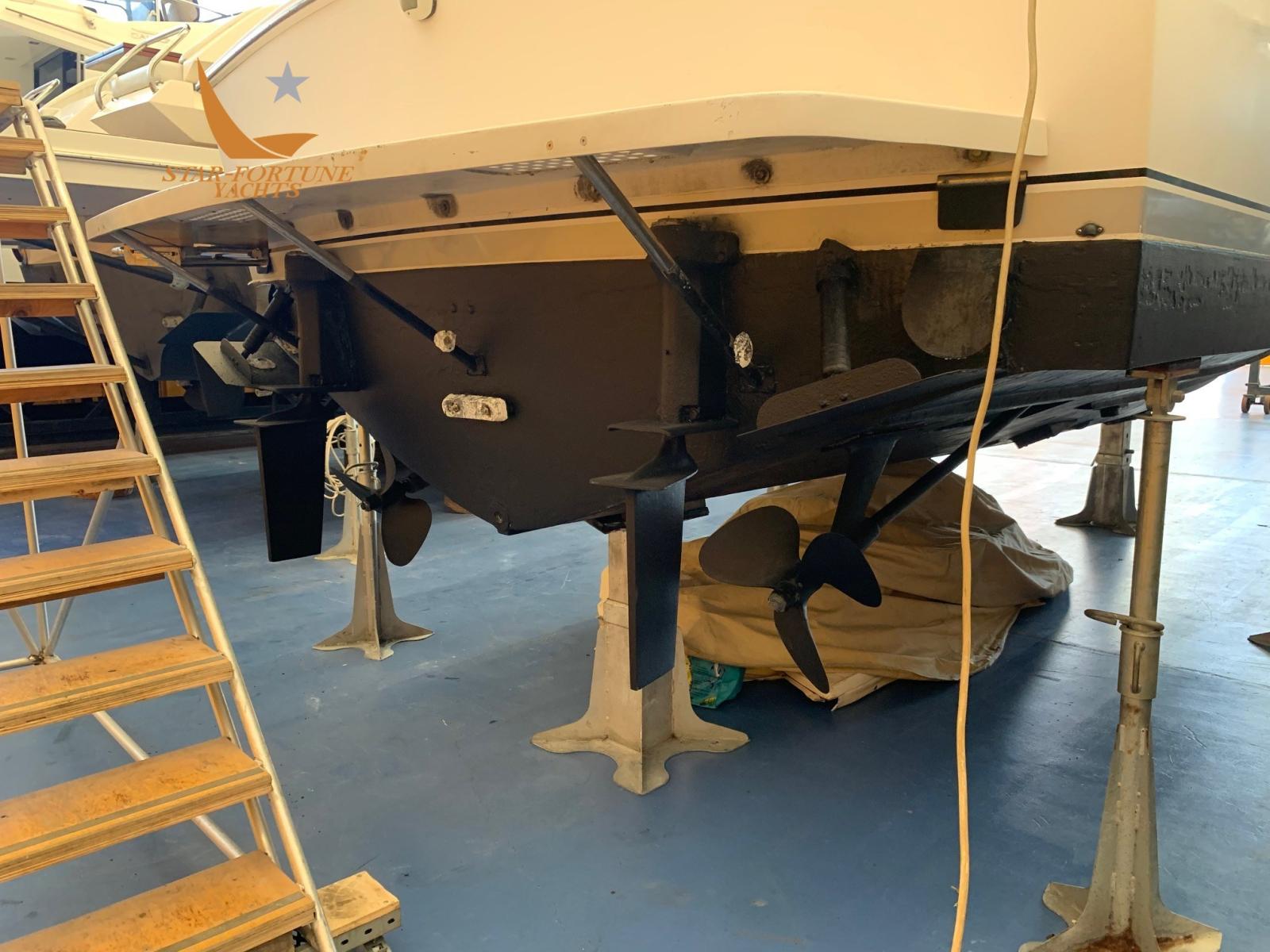 Eau sous pression, Douche de cockpit, Flaps hydrauliques, Plateforme arrière (in teak), Pompe de cale automatique, Pompe de cale manuelle, Porte latérale, Prise de quai, Guindeau électrique, Table pliante de salon.