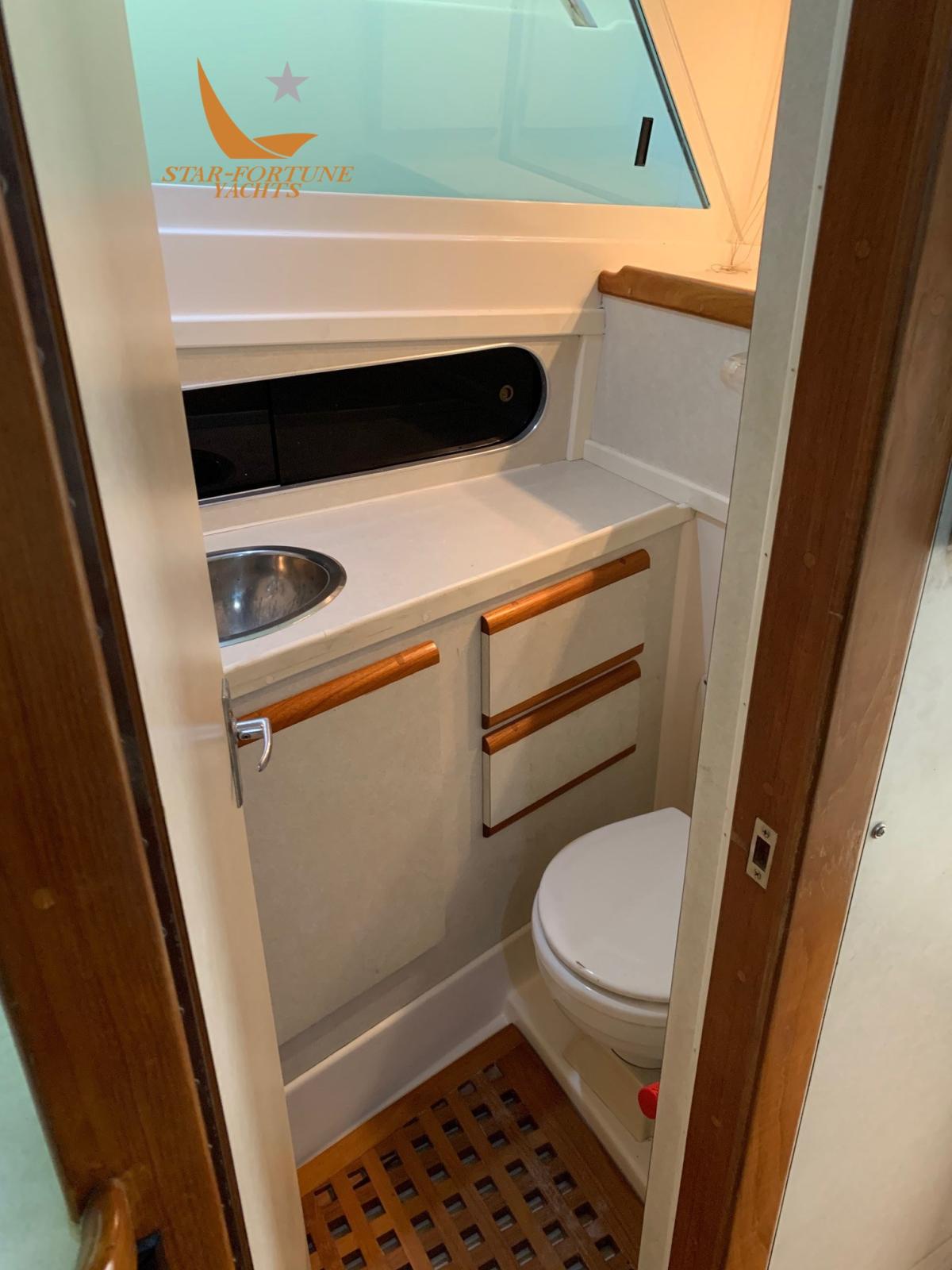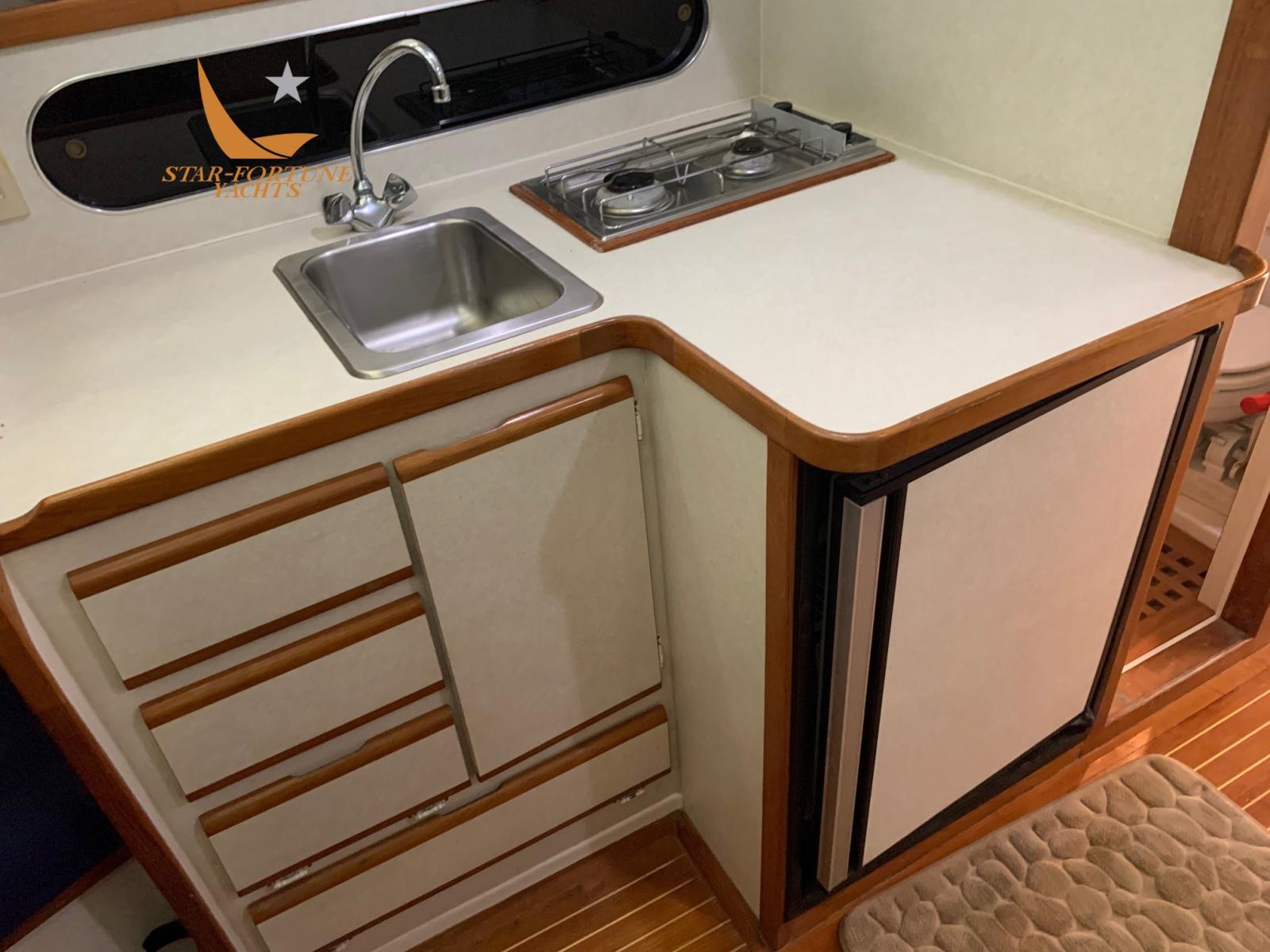 Cabine avant en forme de V, coin repas et cuisine, salle de bain avec douche.