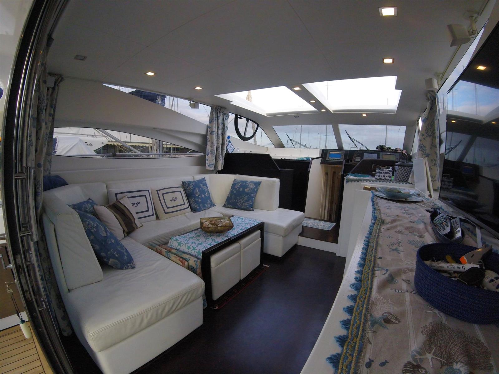 Eau sous pression, 5 Batteries, Passavant en teck (sintetico), Chargeur de batterie (12 + 24), Douche de cockpit (prua e poppa), Phare de poursuite, Flaps hydrauliques, Hard top (Aperetura elettrica), Indicateurs de flaps, Éclairage de courtoisie, Passerelle (Idraulica), Plateforme arrière, Pompe de cale automatique, Porte latérale (in Acciaio), Porte latérale, Cockpit en teck (sintetico), Prise de quai, Connexion eau sous pression à quai, Guindeau électrique, Echelle de bain, table de cockpit, 2 Winch électrique (a poppa).