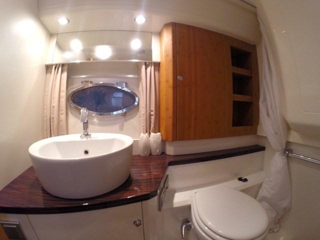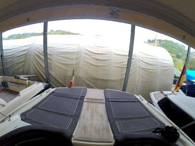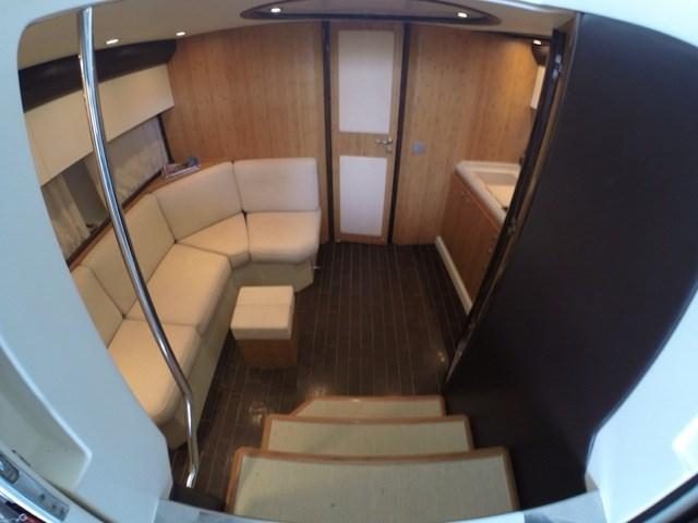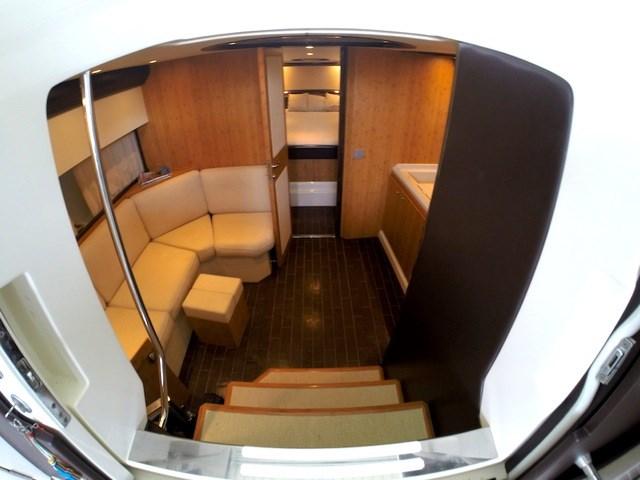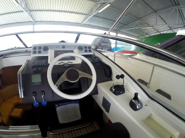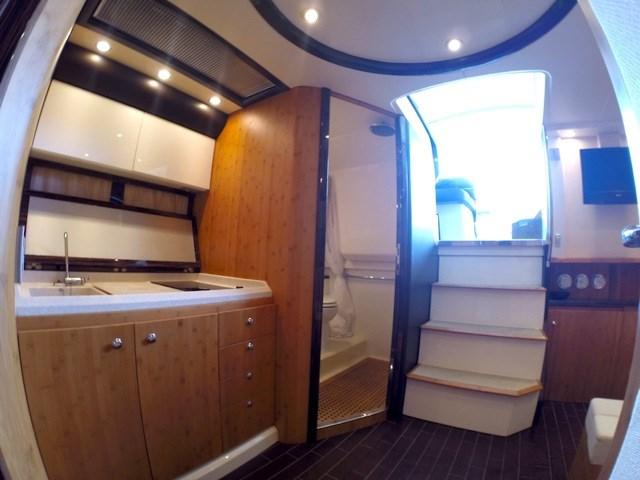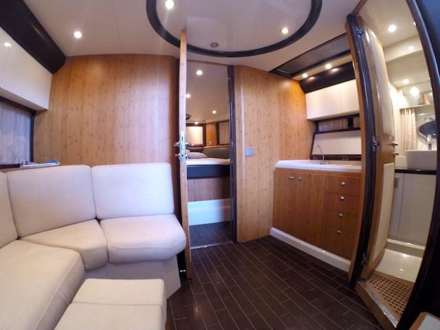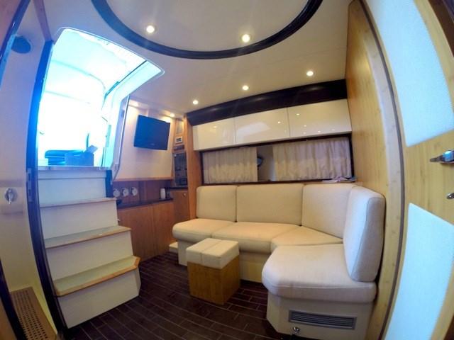 Ce modèle offre une longue terrasse avant, de grands espaces de bronzage, une vie extérieure équipée de canapés, de meubles de table et de cuisine, un mobilier intérieur haut de gamme. Le cockpit peut être à l'abri d'un rideau capable de protéger du soleil ou des intempéries sans compromettre l'esthétique ou l'ergonomie du siège du conducteur, White Hull avec bande brune - photos originales
