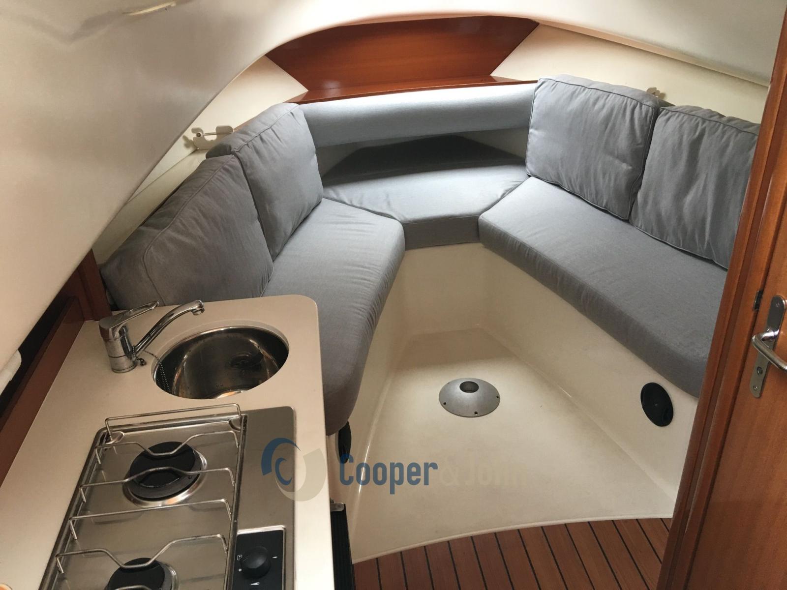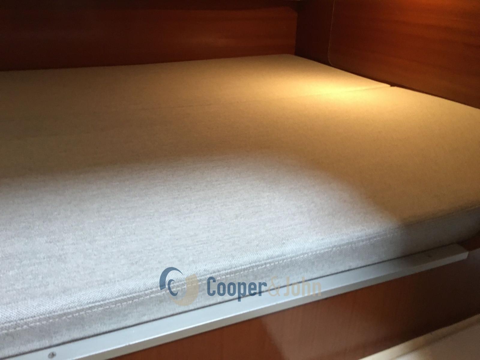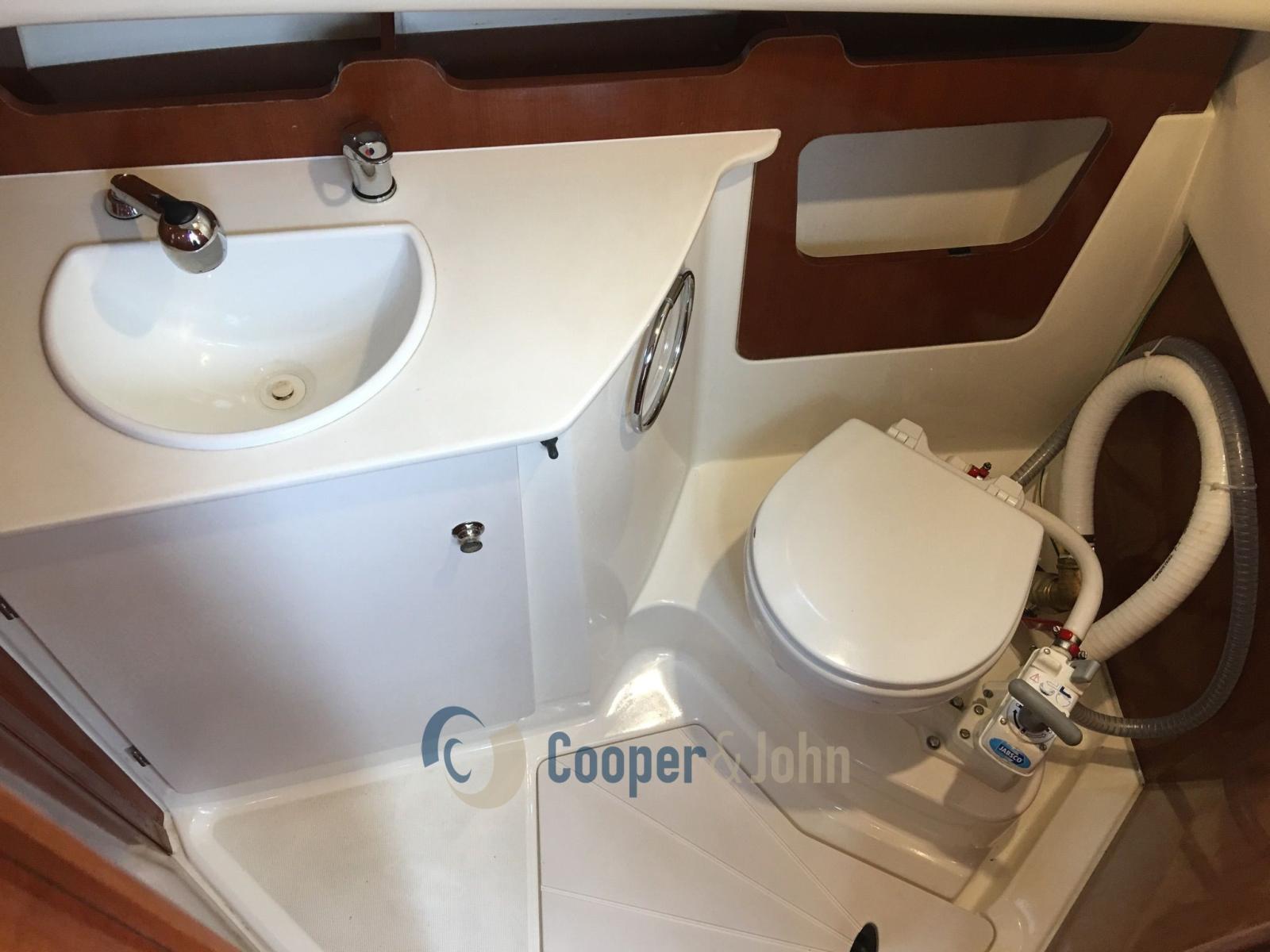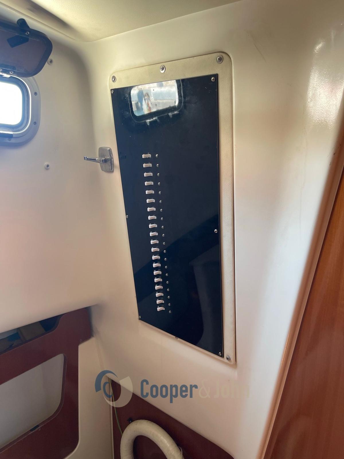 manettes des gaz électroniques - Aménagement intérieur dinette convertible en lit double à l’avant - lit double à l’arrière sous le pont - salle de bain dans pièce séparée avec miroir, lavabo, WC marin, douche 4 lits