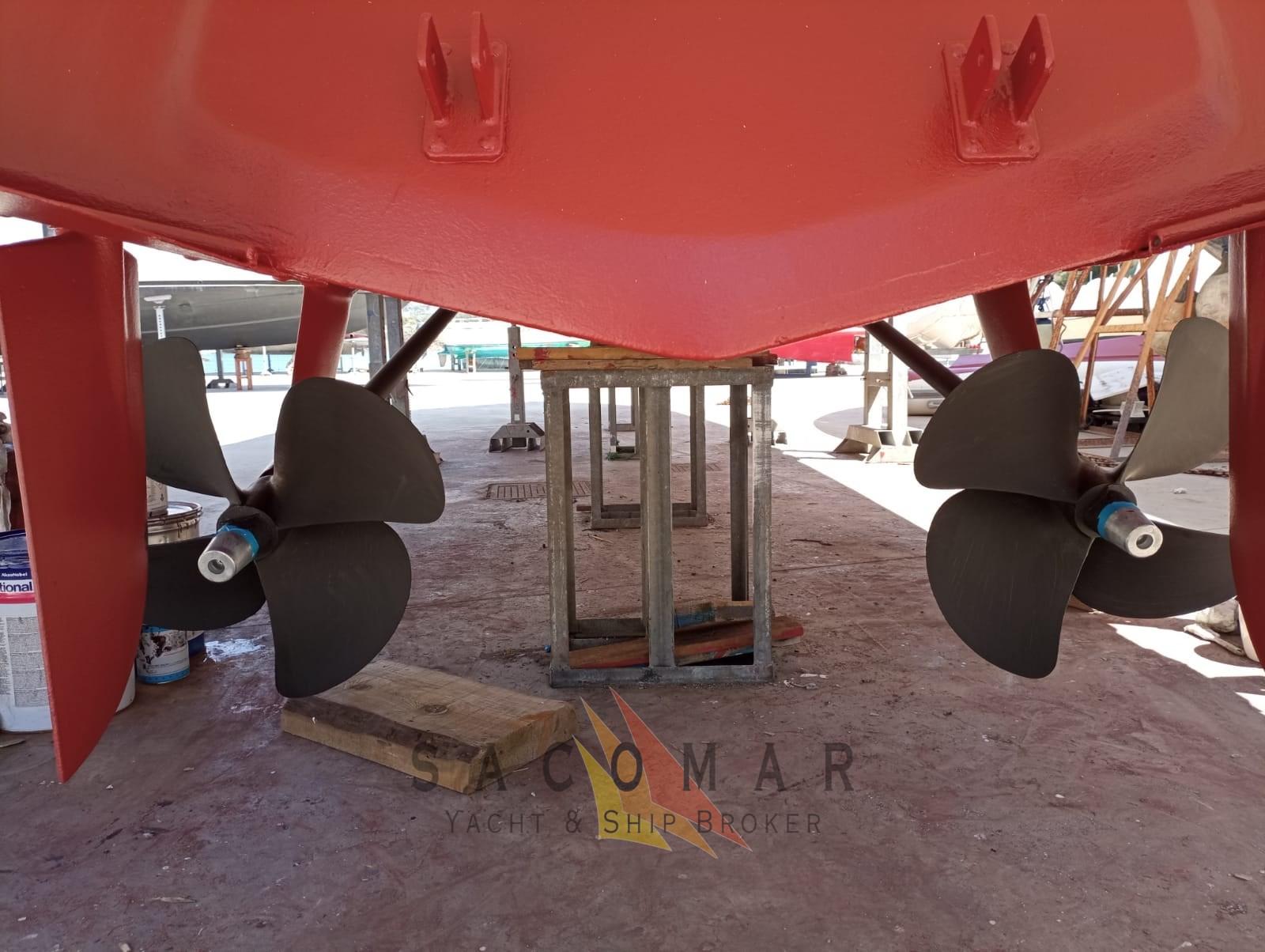 Rasage de coque, traitement anti-osmose, nouvelles prises d’eau de coque et de mer, nouvelles pompes de bain, 3 nouvelles pompes de cale, 2 nouveaux moteurs de 2 240 ampères, 4 nouvelles batteries de service de 800 ampères, nouvelle pompe de vidange de salle de bain, nouvelle plaque de cuisson 4 feux, réfrigérateur congélateur neuf, réfrigérateur bar 220/24 volts, 2 nouveaux onduleurs Victron 24 volts 500/1000, équilibrage d’hélice, four, coussins internes et externes complets et en excellent état, nouveau système d’éclairage LED interne et externe, 4 panneaux solaires 400 W, nouveau chargeur de batterie 60 AMP, nouveau propulseur d’étrave, nouveaux auvents solaires, radar Furuno 16mg sans antenne.